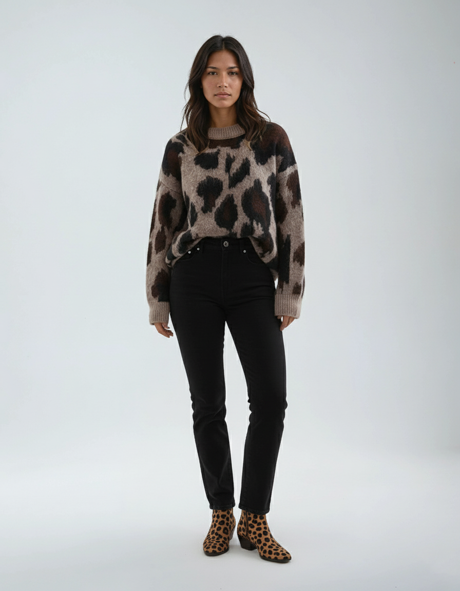 Pair with black denim and ankle boots for a modern everyday look, or lean into the print with leopard boots for a daring, coordinated statement. For a chic twist, tuck it into a leather skirt with heels. Whether dressed up or down, this sweater ensures you stand out with confident style and cozy comfort.