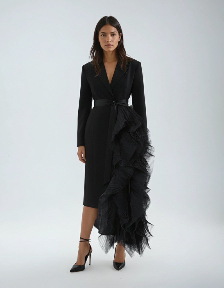 A striking balance of tailoring and drama, this long jacket features a sleek, structured silhouette with an asymmetrical cascade of mesh ruffles flowing from the waist to the hem. The single-button closure with a self-tie belt cinches the waist for a flattering fit, while the elongated length adds refined elegance.
