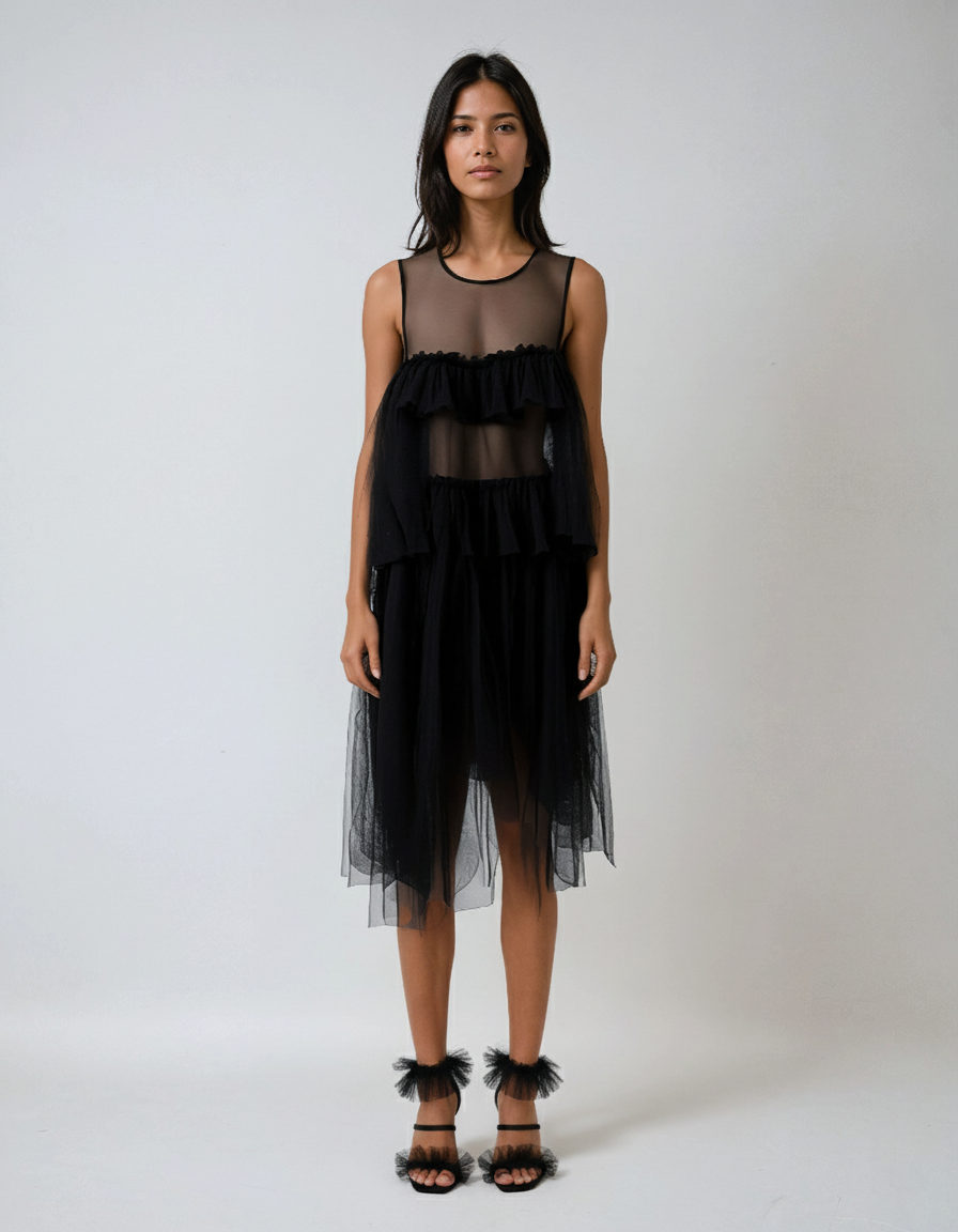 Dark, deconstructed, and unapologetically experimental—the Black Irregular Ruffle Dress is a wearable art piece that blurs the line between structure and movement. Featuring a sheer bodice and layers of raw-edged, asymmetrical ruffles, this sleeveless dress plays with volume and light. The bold transparency of the top contrasts with the dramatic, cascading tulle skirt, creating a striking silhouette that demands attention.