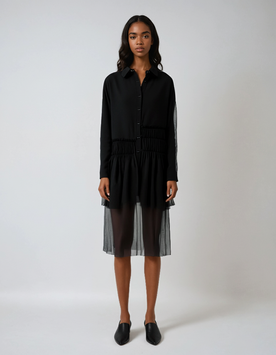 Blurring the line between shirt and statement piece, the Black Spliced Mesh Blouse features a sharp collared button-down upper fused with sheer tulle textures below the waist. The design transitions from structured cotton to flowing mesh with layered pleats, offering a dramatic contrast in both form and feel. Its midi-length silhouette allows it to be worn as a blouse, tunic, or shirt dress depending on styling.