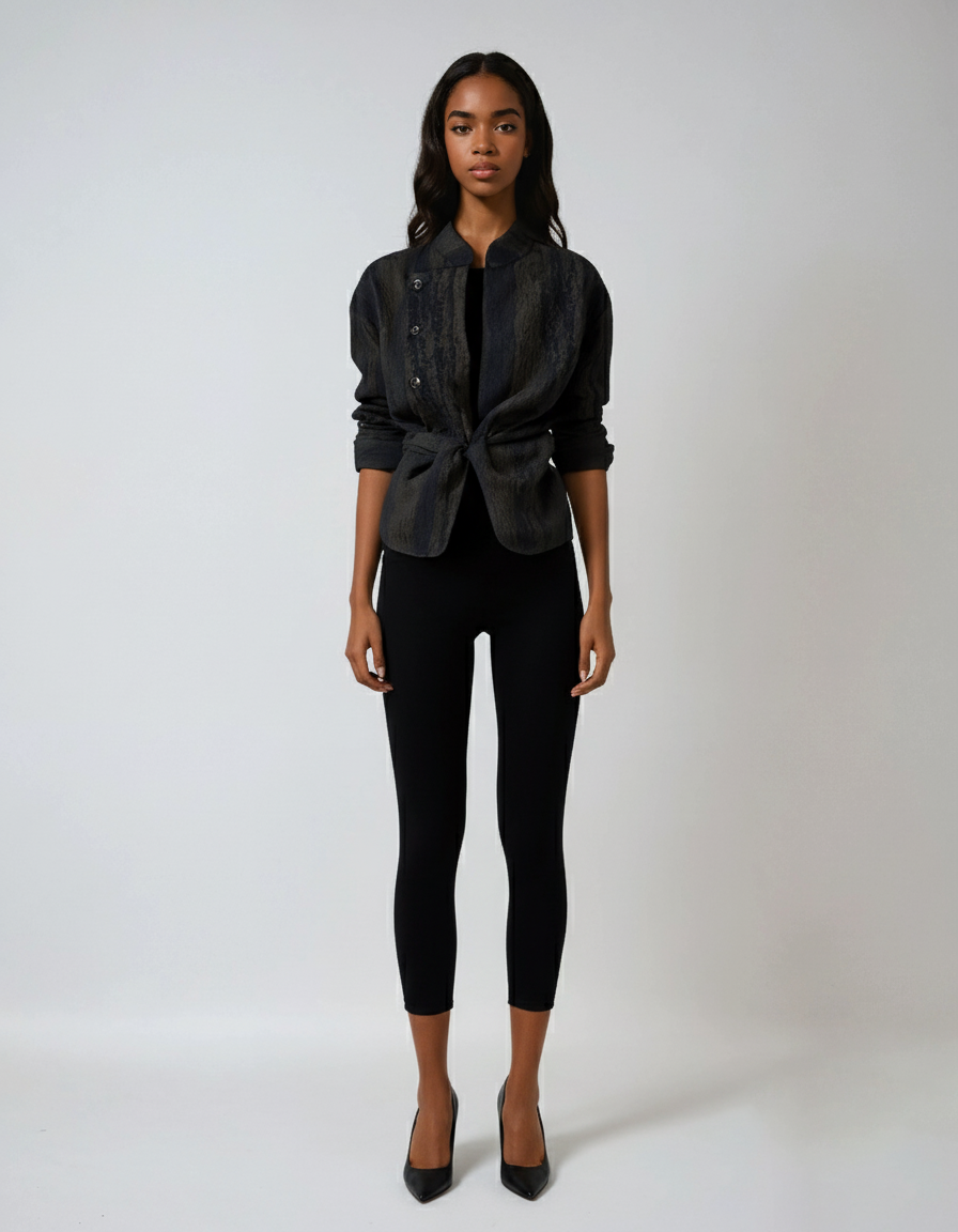 Pair it with black leggings or tailored trousers for a sleek, casual look, or tuck it into a high-waisted skirt and boots for a polished urban edge. Layer with a structured blazer or wear solo to let the knotted detail do the talking. From studio days to evening socials, this blouse redefines understated sophistication.