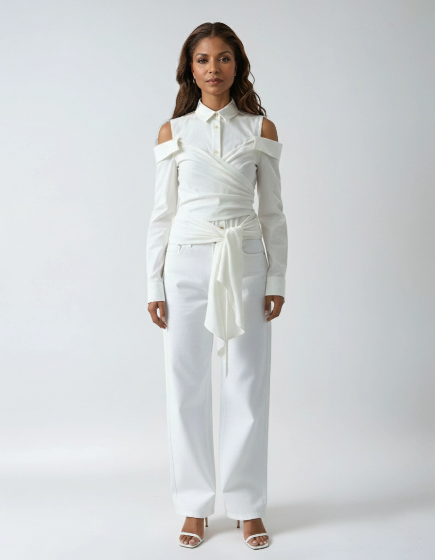Pair it with high-waisted jeans and heels for an effortlessly chic day-to-night look. Dress it up with a pencil skirt and bold jewelry for evening sophistication, or keep it casual with tailored shorts and sandals. Its timeless off-shoulder design makes it a versatile piece that can elevate any outfit.