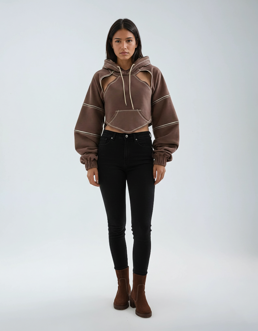 A bold twist on streetwear essentials, this sweatshirt features cut-out details with contrasting fabric panels, giving it a dynamic, fashion-forward edge. The classic hooded design is reimagined with unexpected cut lines, while the relaxed silhouette offers both comfort and style.