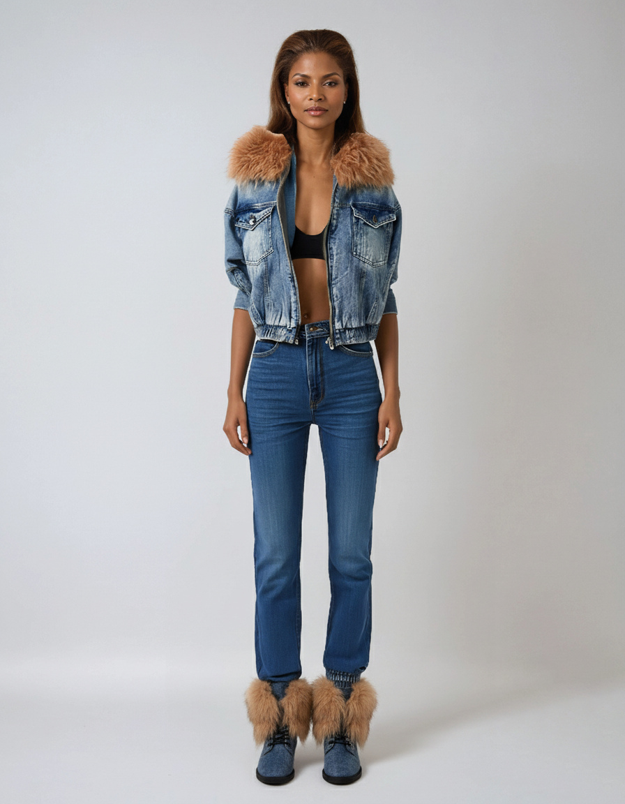 Expertly crafted from a durable blend of cotton and polyester, this jacket offers the rugged appeal of denim with the comfort of modern insulation. The soft faux-fur collar adds a touch of luxury and winter-ready functionality. Strong seams, high-quality zipper hardware, and reinforced pocket flaps highlight the jacket’s thoughtful construction designed for longevity.