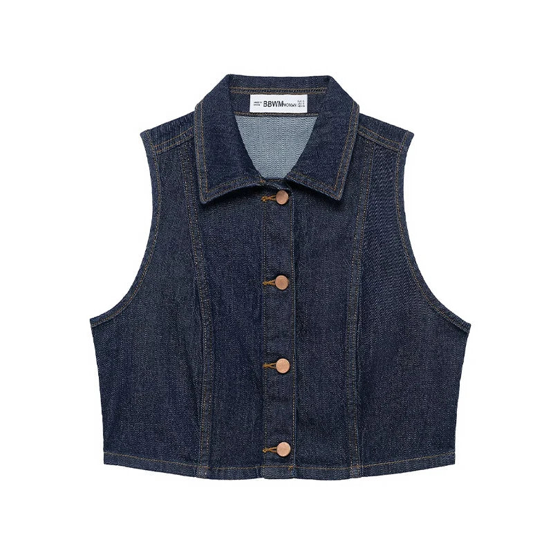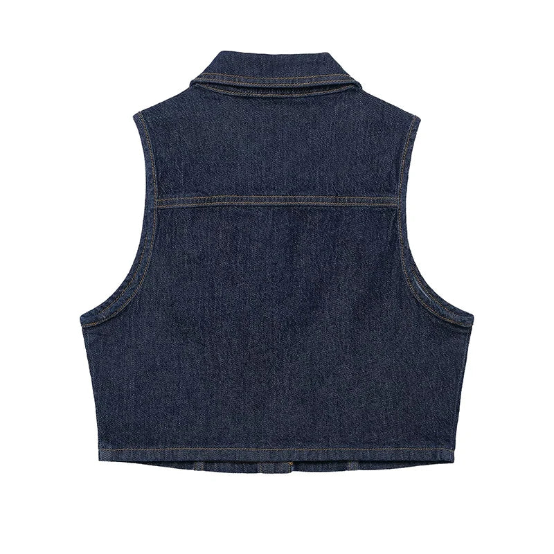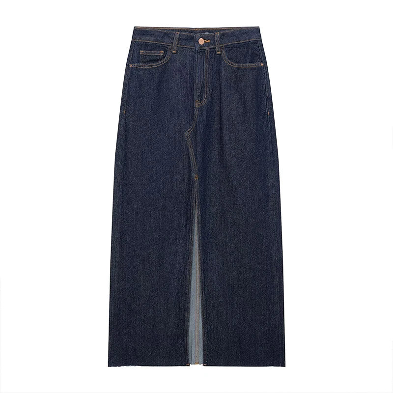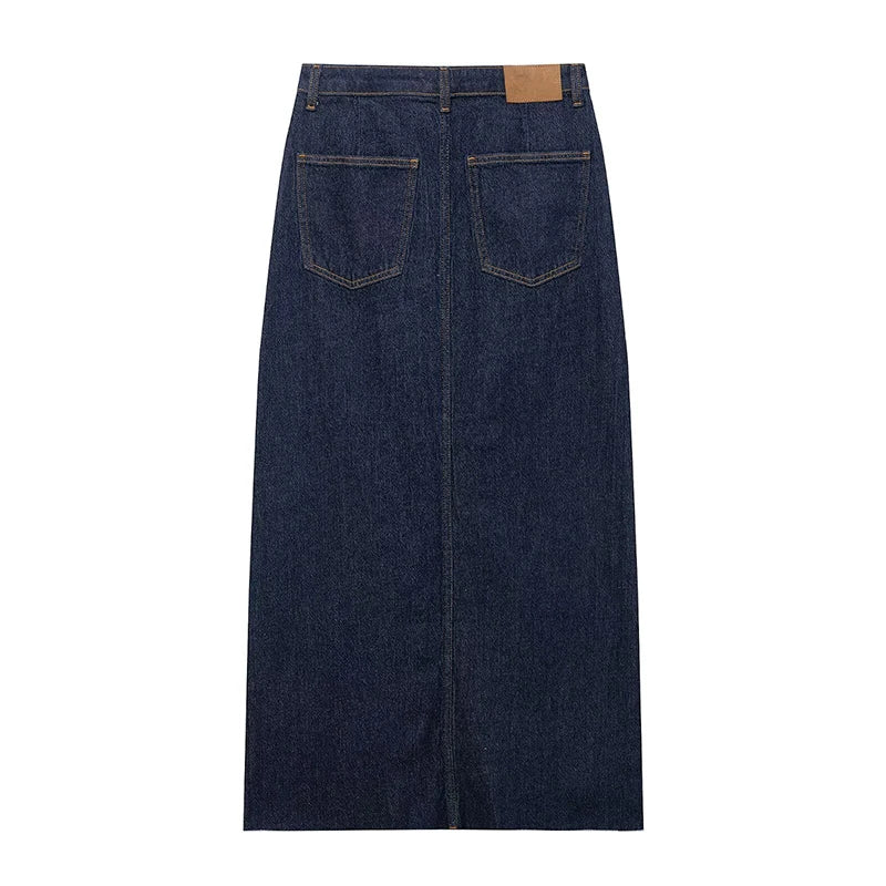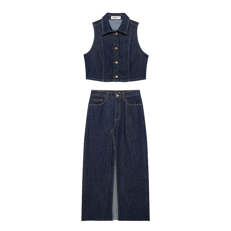 This versatile denim set includes a cropped vest-style top and a high-waisted maxi skirt, both crafted in rich, dark-wash denim. The top features a button-up front with a collar, offering a clean, structured silhouette. The skirt's floor-length cut is complemented by a sleek front slit, allowing for fluid movement while maintaining a sharp and modern appearance.