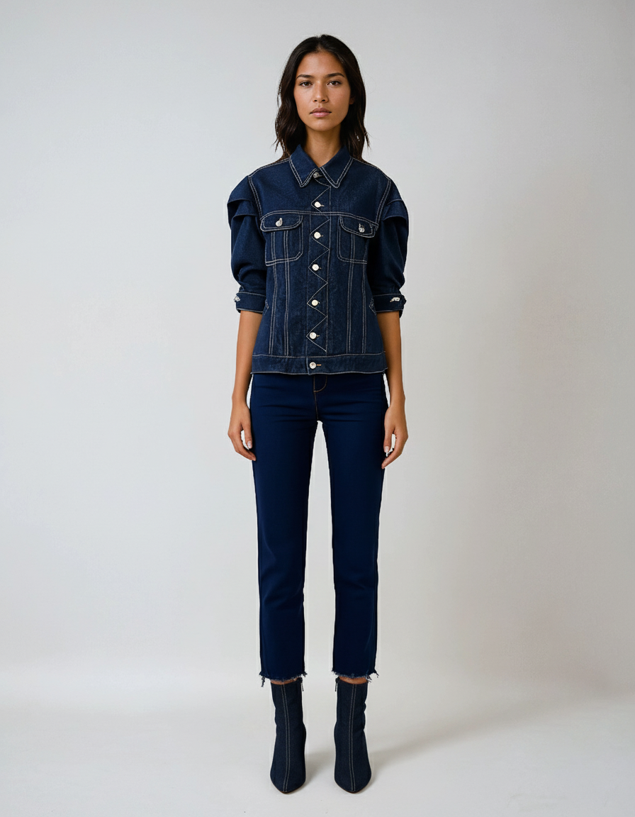 The Denim Oversize Jacket is a bold reimagining of a timeless wardrobe essential. Crafted in deep indigo denim, it features exaggerated shoulders and voluminous sleeves that add a dramatic edge to the classic trucker silhouette. With sharp tailoring, contrast stitching, flap chest pockets, and metal button fastenings, it strikes the perfect balance between vintage utility and modern streetwear flair.