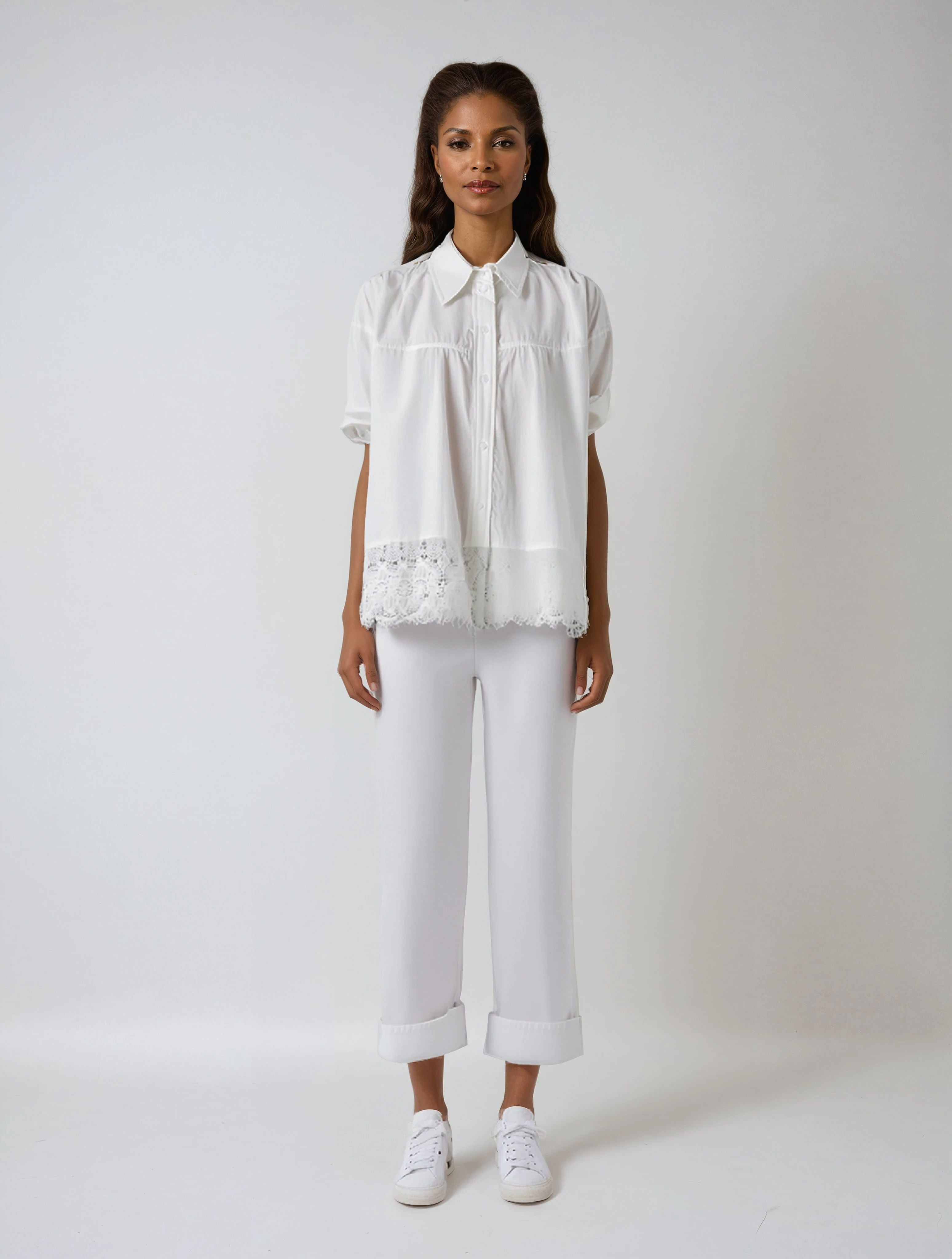 Made from a soft, breathable blend of cotton and polyester, this blouse ensures comfort with structure. The fabric is smooth to the touch, while the lace hem is crafted with precision to create beautiful patterns without fraying. Button-down closure allows versatile wear—from fully fastened for a formal look to partially unbuttoned for casual charm.