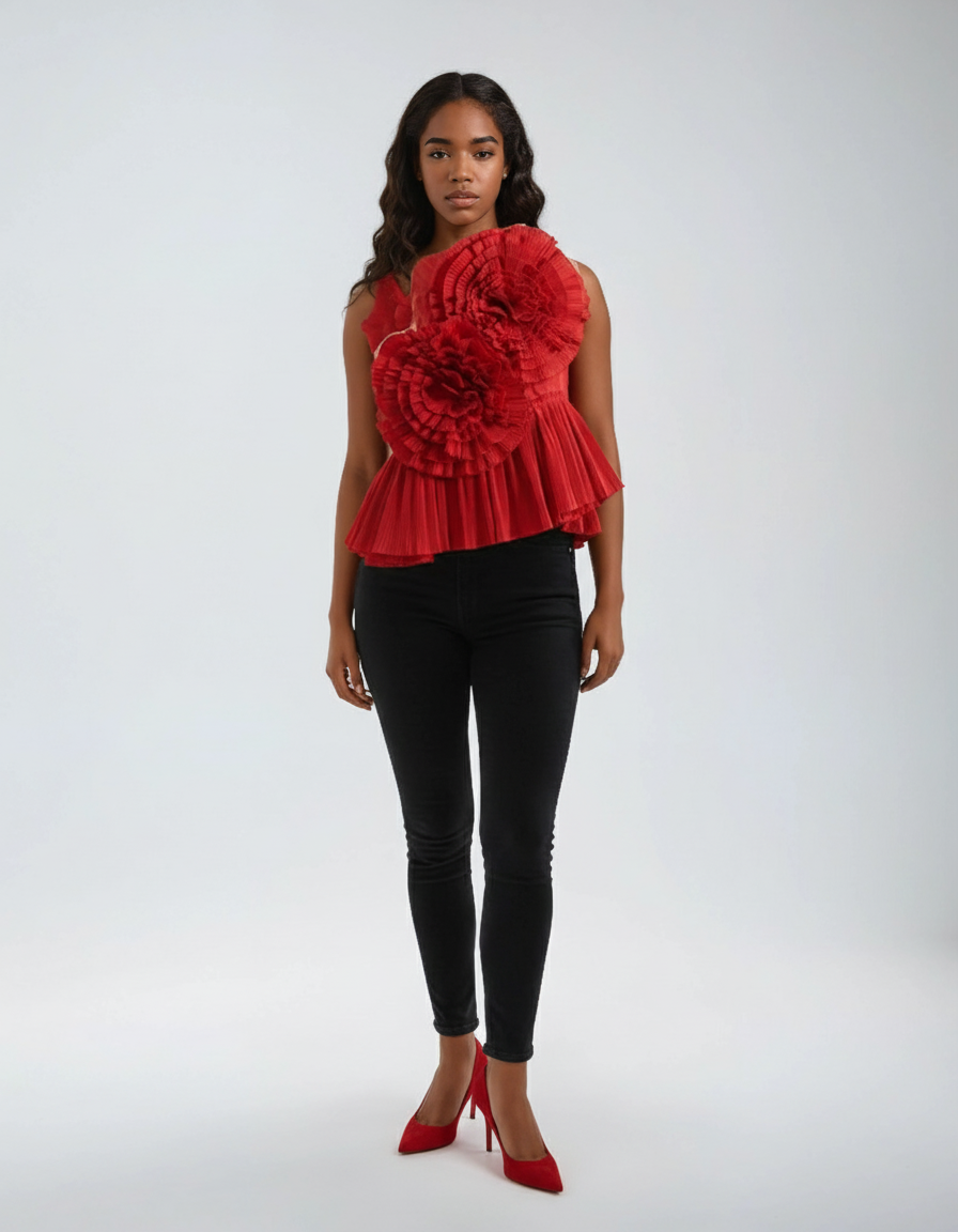 Turn heads with this sculptural pleated tank top designed in a striking red hue. Featuring oversized 3D floral appliqués crafted entirely from pleated fabric, this piece combines bold artistry with feminine elegance. The asymmetrical hemline and structured pleats create dramatic volume, transforming a simple tank top into a true statement piece.