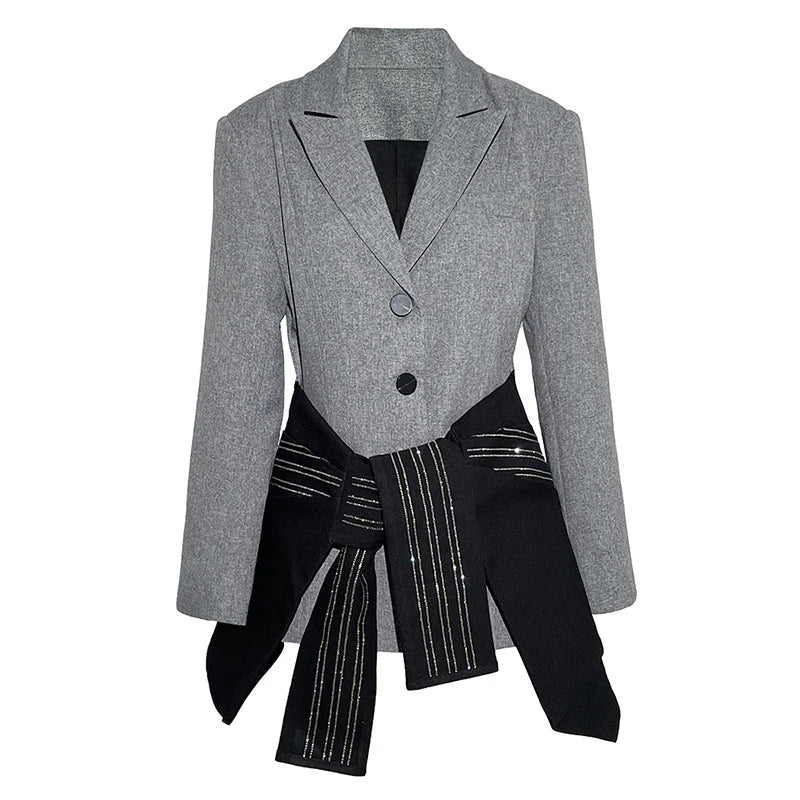 Made from a premium blend of cotton and polyester, this blazer combines durability with comfort. The gray fabric offers a smooth, tailored finish, while the bandage wrap introduces movement, texture, and layering dimension. Precision stitching and structured lapels underscore its high-fashion detailing, making it a standout piece for modern wardrobes.