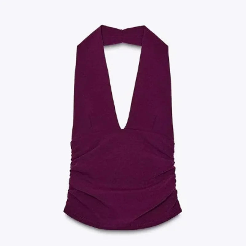 Top: Halter neckline, sleeveless, cropped, and backless for a sexy statement
