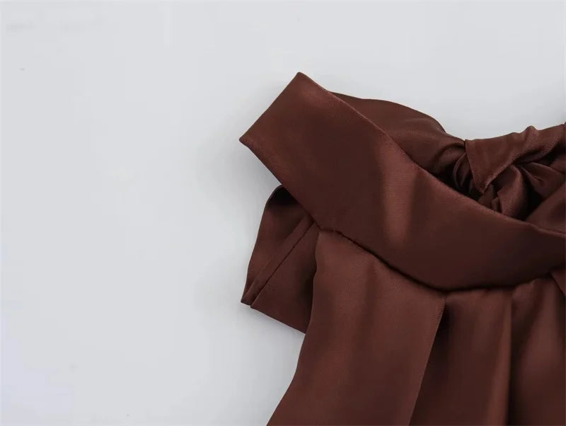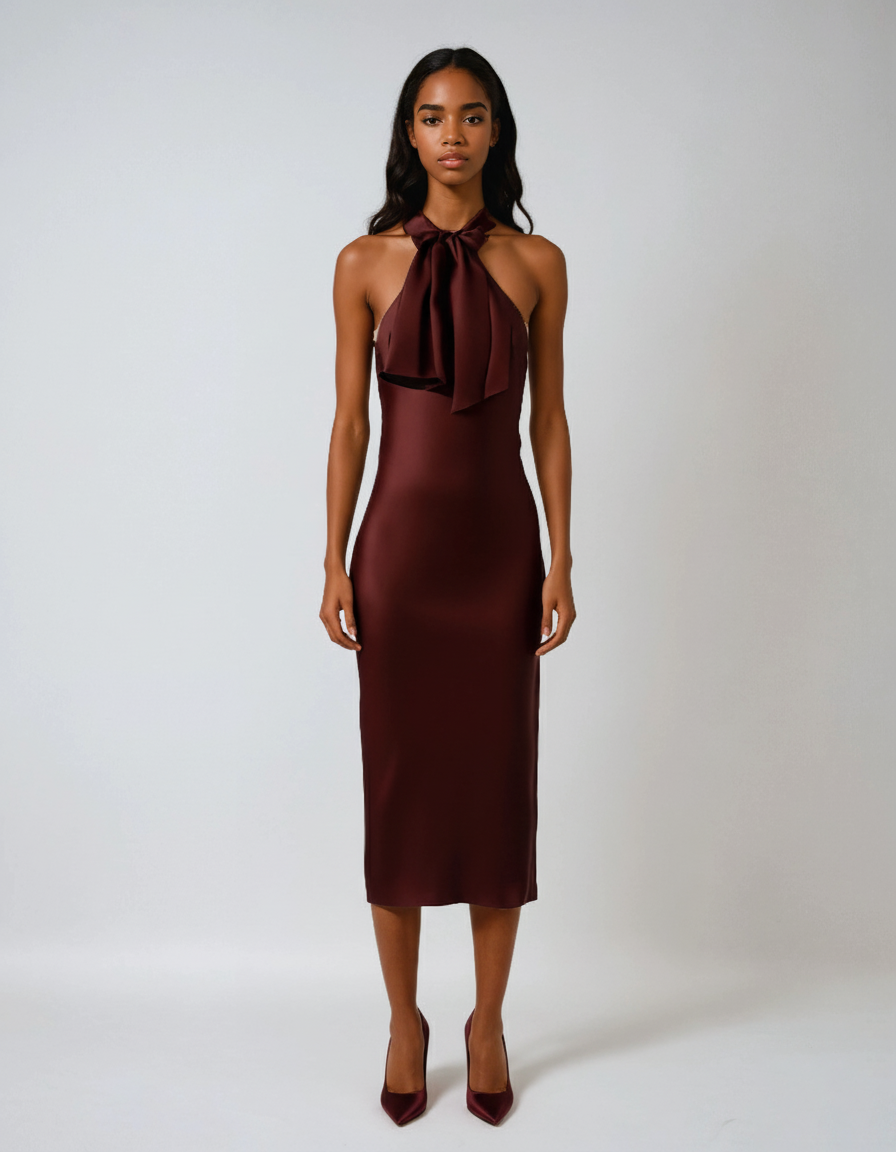 A bold reinterpretation of classic eveningwear, this halter satin dress features a neck-mounted halter neckline and off-shoulder sleeves that reveal just enough. The straight silhouette flows effortlessly to mid-calf, while the open back adds dramatic contrast. With a sleek, sleeveless cut and minimal seams, this dress offers pure form and fluidity—perfect for summer nights that call for quiet impact.