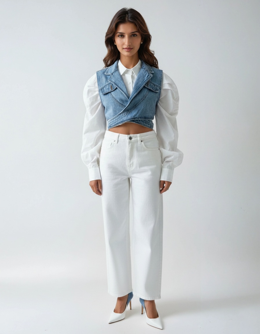 This standout blouse combines classic tailoring with modern denim edge. Featuring a crisp white button-up shirt base with dramatic puff sleeves, it’s overlaid with an irregular cropped denim vest that crosses at the waist for a structured, fashion-forward look. The mix of soft cotton shirting and rugged denim creates a bold layered effect in one easy-to-wear piece.