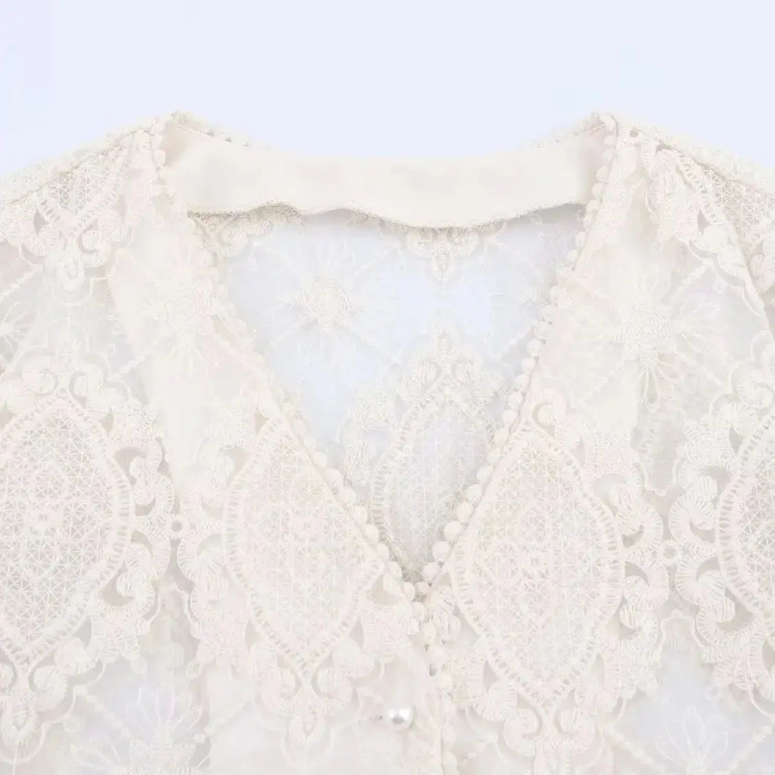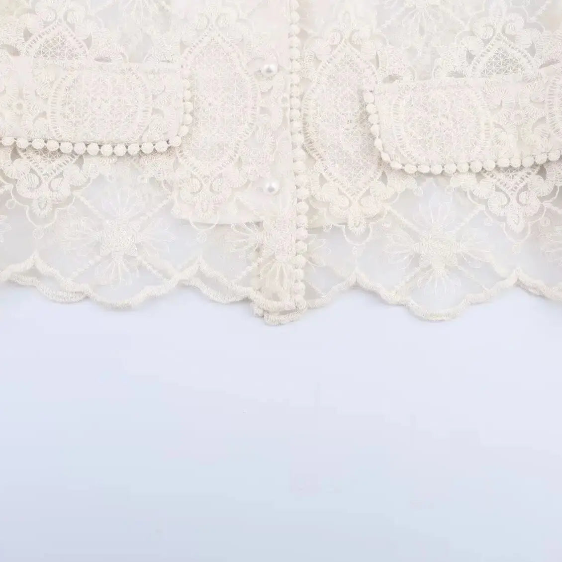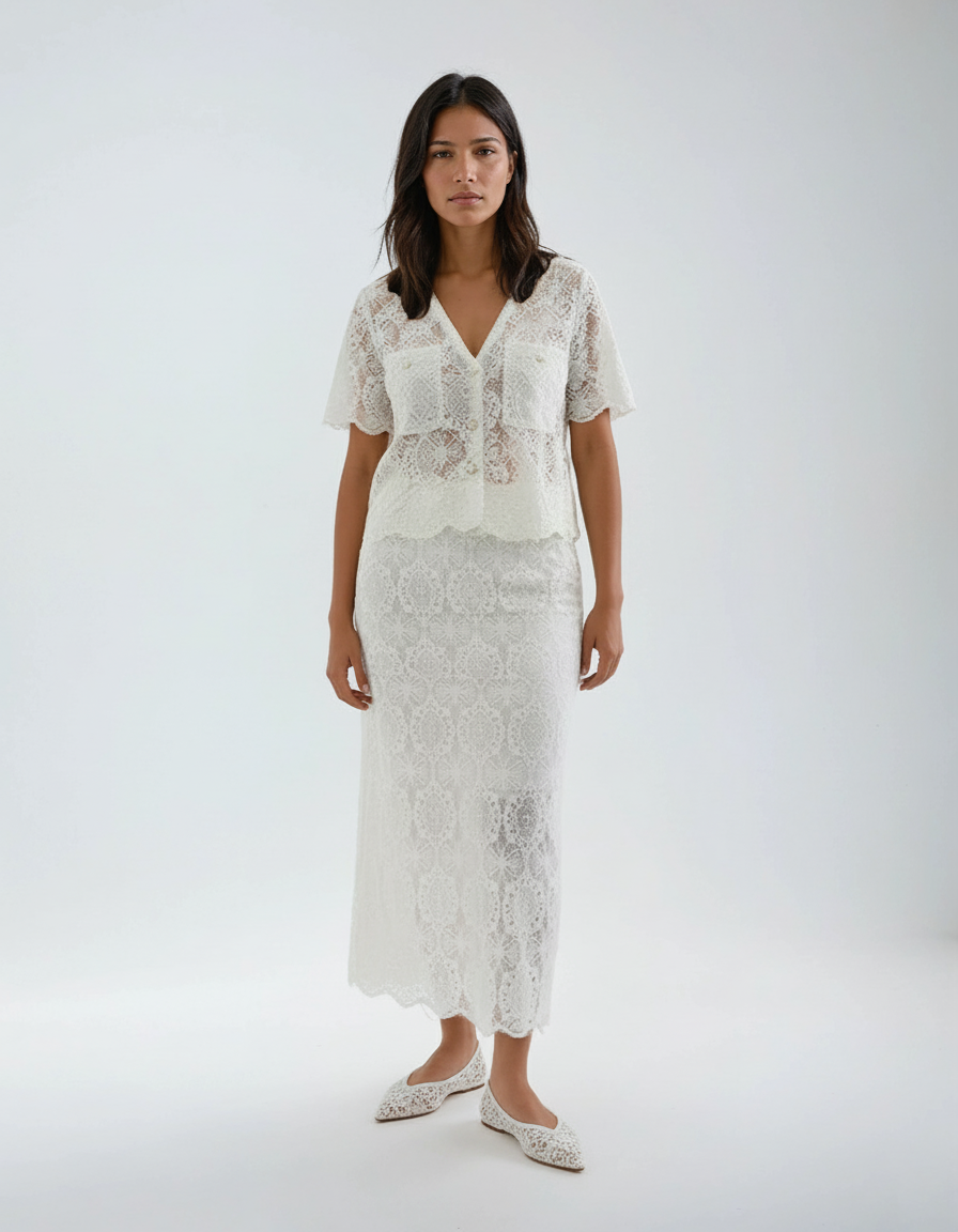 A delicate balance of flirtation and finesse, this breezy two-piece set features a cropped mesh-embroidered shirt and a sleek rear-split midi skirt. The top is tailored with a V-neckline, short sleeves, and a single-breasted closure that hits just above the waist—ideal for showcasing the matching high-rise skirt. The straight tube silhouette and discreet rear slit offer a refined yet breathable structure perfect for warmer seasons.