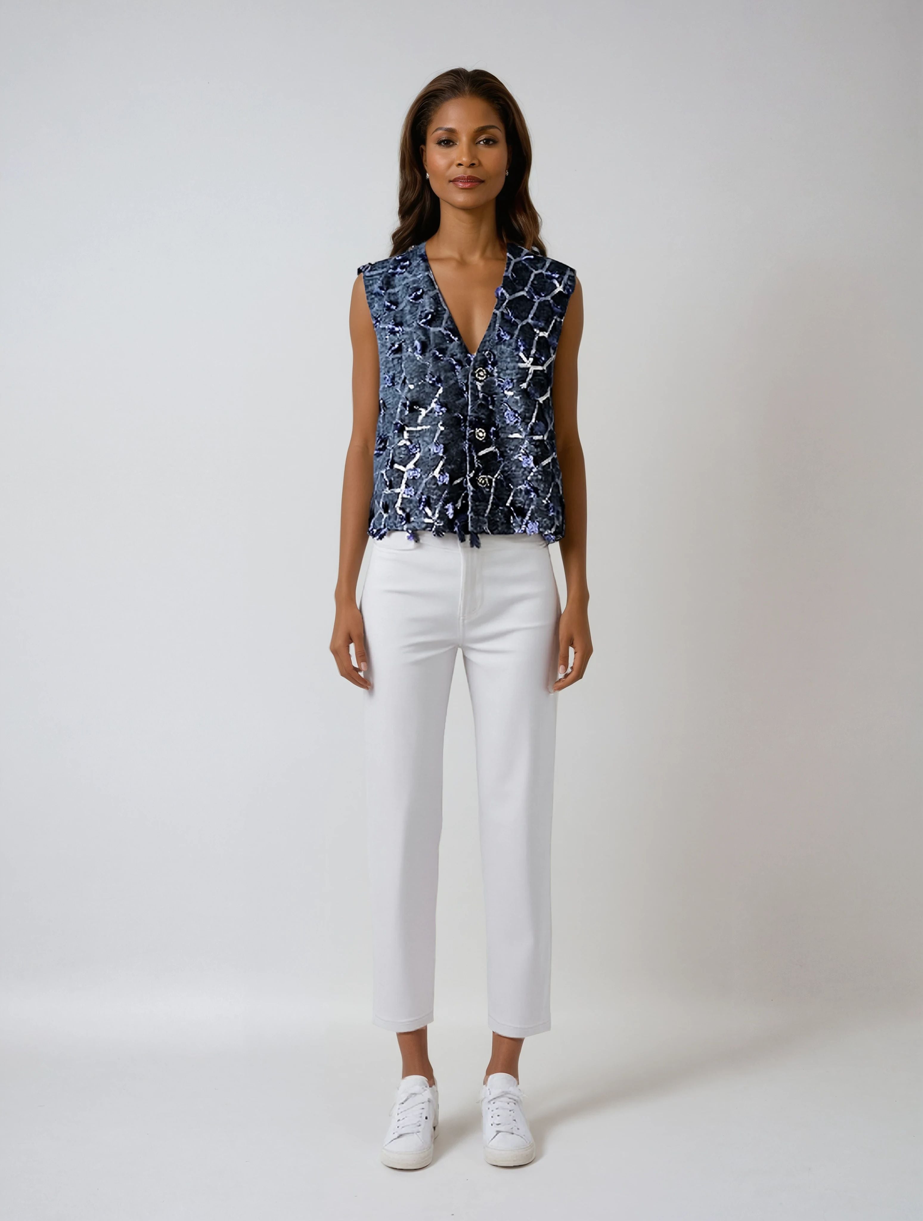 Effortlessly blending casual denim charm with a touch of glam, this vest features an intricate overlay of sequins and embroidered floral accents arranged in a geometric lattice pattern. The sleeveless, relaxed cut makes it perfect for layering, while the deep V-neckline and front button closure lend it a tailored, vest-like appeal.