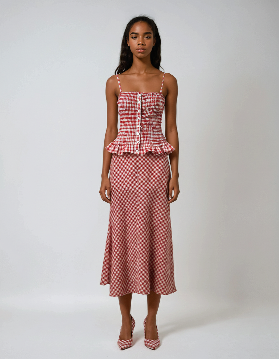 This two-piece plaid set blends vintage charm with breezy summer elegance. The ruched crop top features a flattering slash neckline, slim silhouette, and open back for a playful, sun-ready look. Paired with a high-waisted straight-cut midi skirt, the outfit balances feminine detailing with clean, structured lines—ideal for vacations, picnics, and warm-weather weekends.