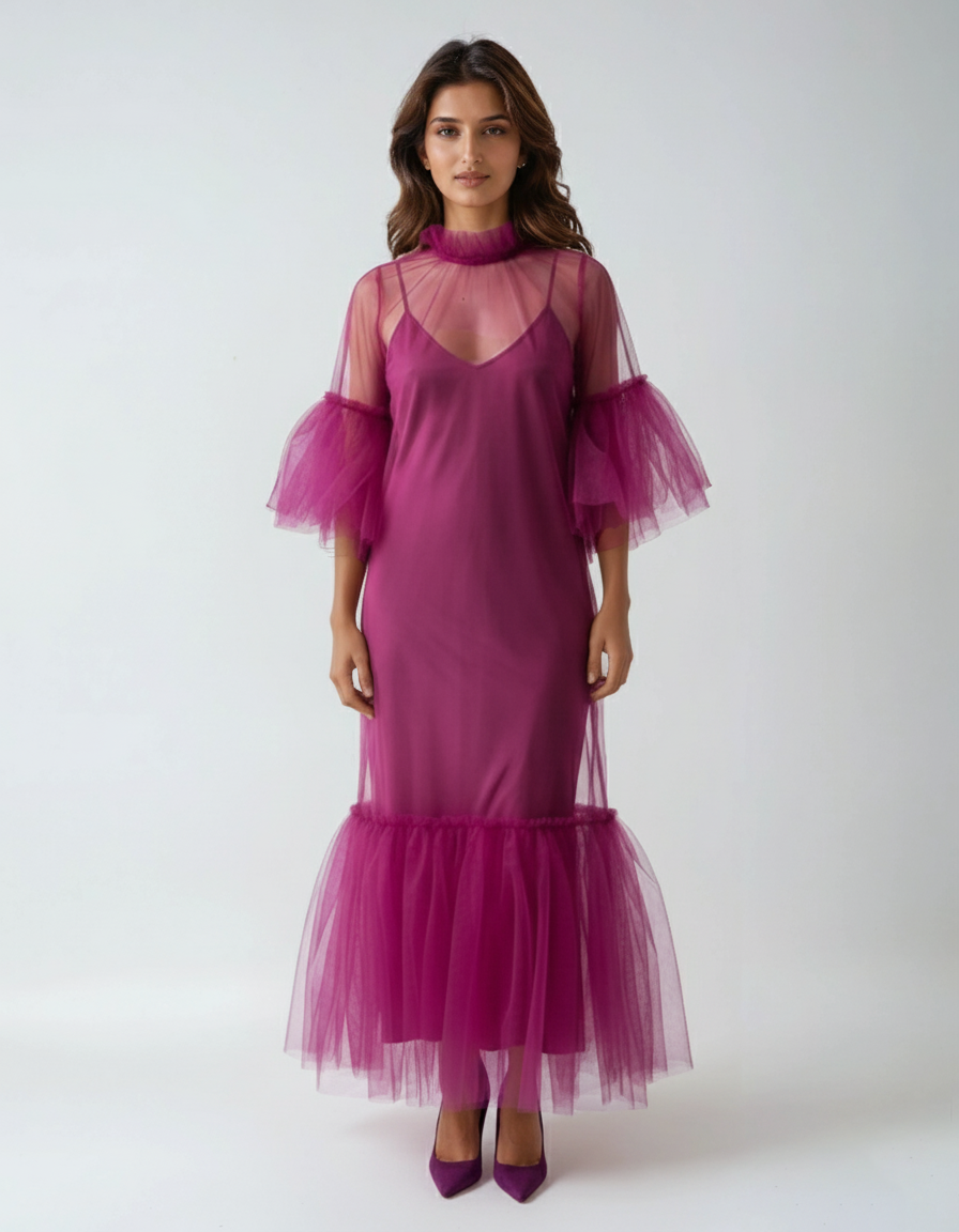 Bold and ethereal, this dress is crafted in sheer mesh fabric with dramatic ruffled accents at the sleeves and hemline. The round neckline and flowing straight silhouette create a sense of lightness, while the exaggerated ruffles bring a statement-making, couture-inspired feel. Its translucent structure makes it a daring yet elegant choice for layering.