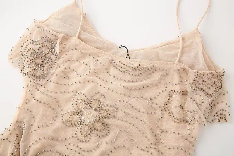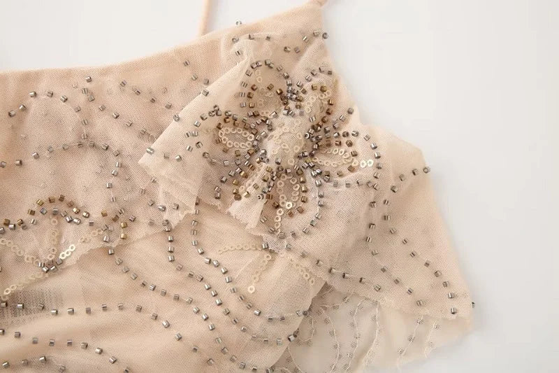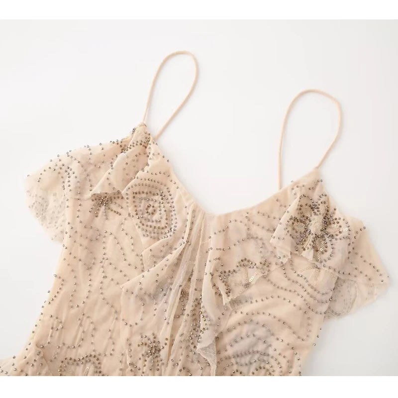 Elevate your summer evenings with the Sequin Ruffle Midi Dress, featuring a shimmering glitter finish and a sophisticated backless camisole design. The delicate ruffle detailing adds movement and elegance, making it perfect for special occasions or stylish nights out. Crafted to combine comfort with standout glamour, this dress ensures you shine effortlessly while staying cool and confident.