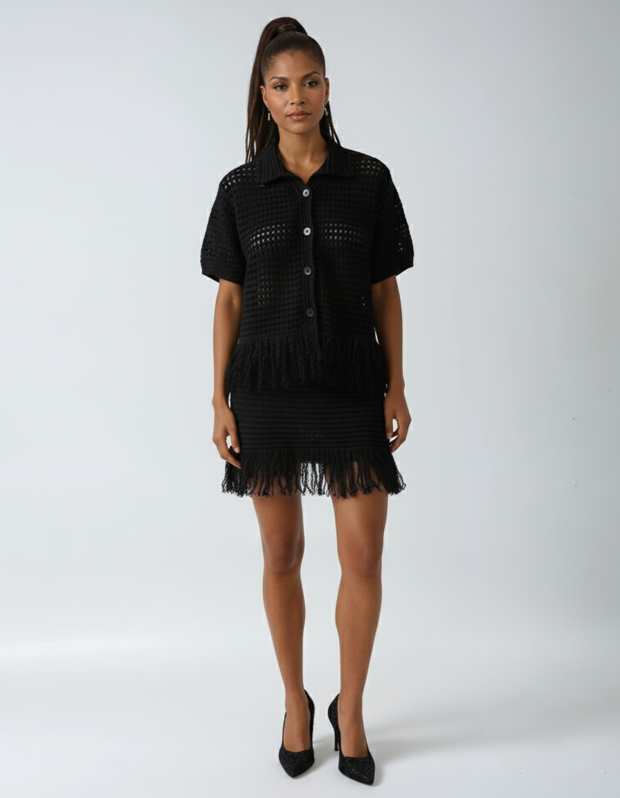 This two-piece set blends playful charm with polished structure, featuring a short-sleeved knitted jacket with a turn-down collar and tassel accents, paired with a matching above-the-knee mini skirt. The subtle plaid texture and tassel trim add dynamic movement, while the A-line silhouette of the skirt creates a flattering finish.
