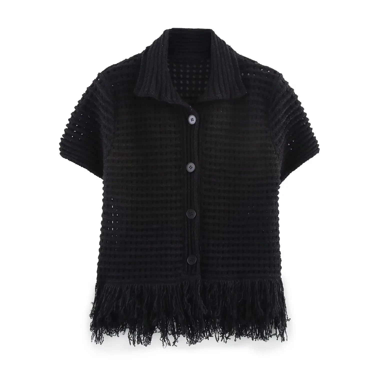 This summer ensemble features a short-sleeved knitted jacket with a classic plaid pattern and decorative tassels, complemented by a matching tassel-adorned mini skirt. The lapel design adds a refined touch, while the lightweight knit fabric ensures comfort and breathability in warmer weather. Ideal for stylish, seasonal layering, this set balances playful details with a polished silhouette for versatile day-to-night wear.