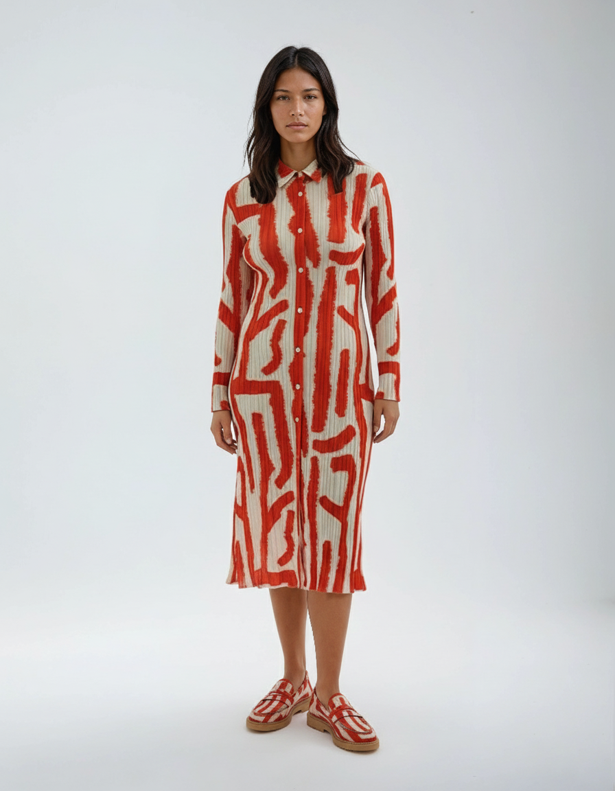 This dress fuses artistic boldness with timeless structure, featuring a full-length pleated silhouette with a striking red-and-white contrast pattern. The classic shirt collar and button-down front add tailored sophistication, while the vertical pleats elongate the figure and bring fluid movement. Perfect for making a statement in both casual and elevated settings.