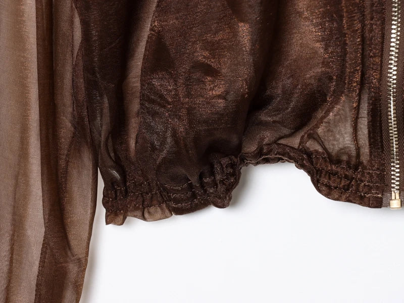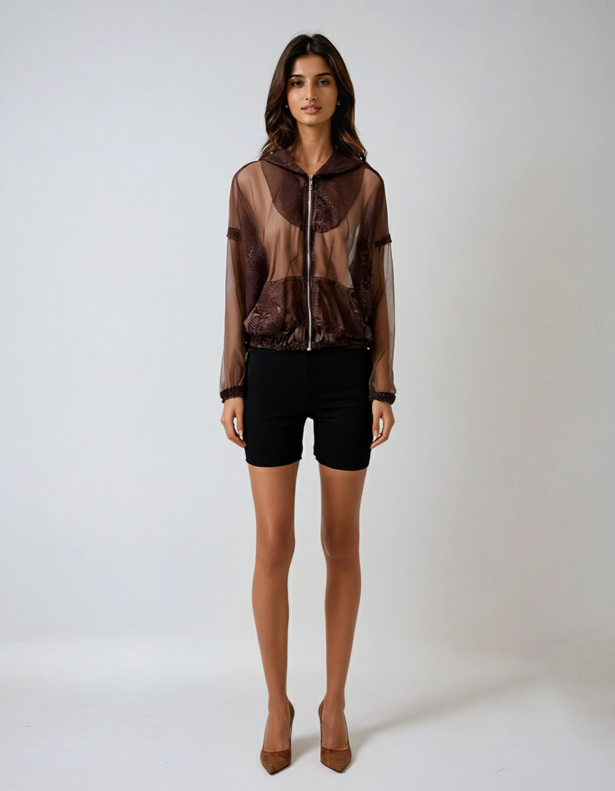 Step into summer sophistication with this sleek commuting jacket, designed with a versatile hooded collar for a touch of urban flair. Featuring a smooth front zipper closure, functional pockets, and subtle ruffle detailing, it blends polished style with everyday practicality. The regular-fit silhouette ensures ease of movement while maintaining a smart, structured look.