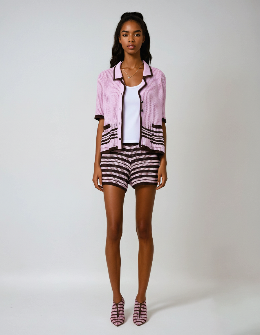 Crafted from a breathable knitted fabric with 96%+ synthetic fiber content, this set offers slight stretch for a close, flexible fit. The knit texture adds depth and softness, while the solid color palette keeps it minimal and refined. The top is detailed with polished buttons, and the shorts feature an elastic waistband with tie detail for easy all-day wear.