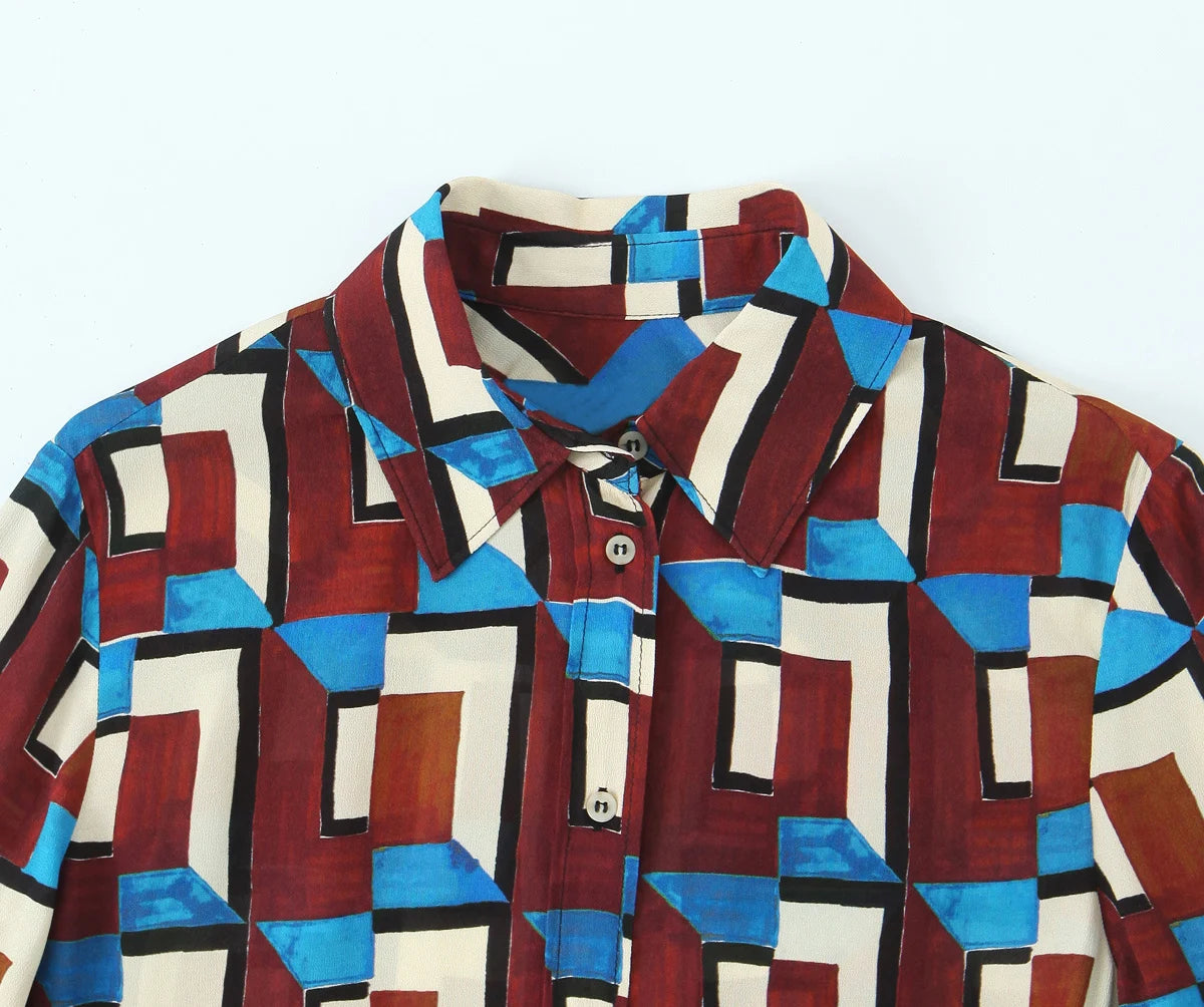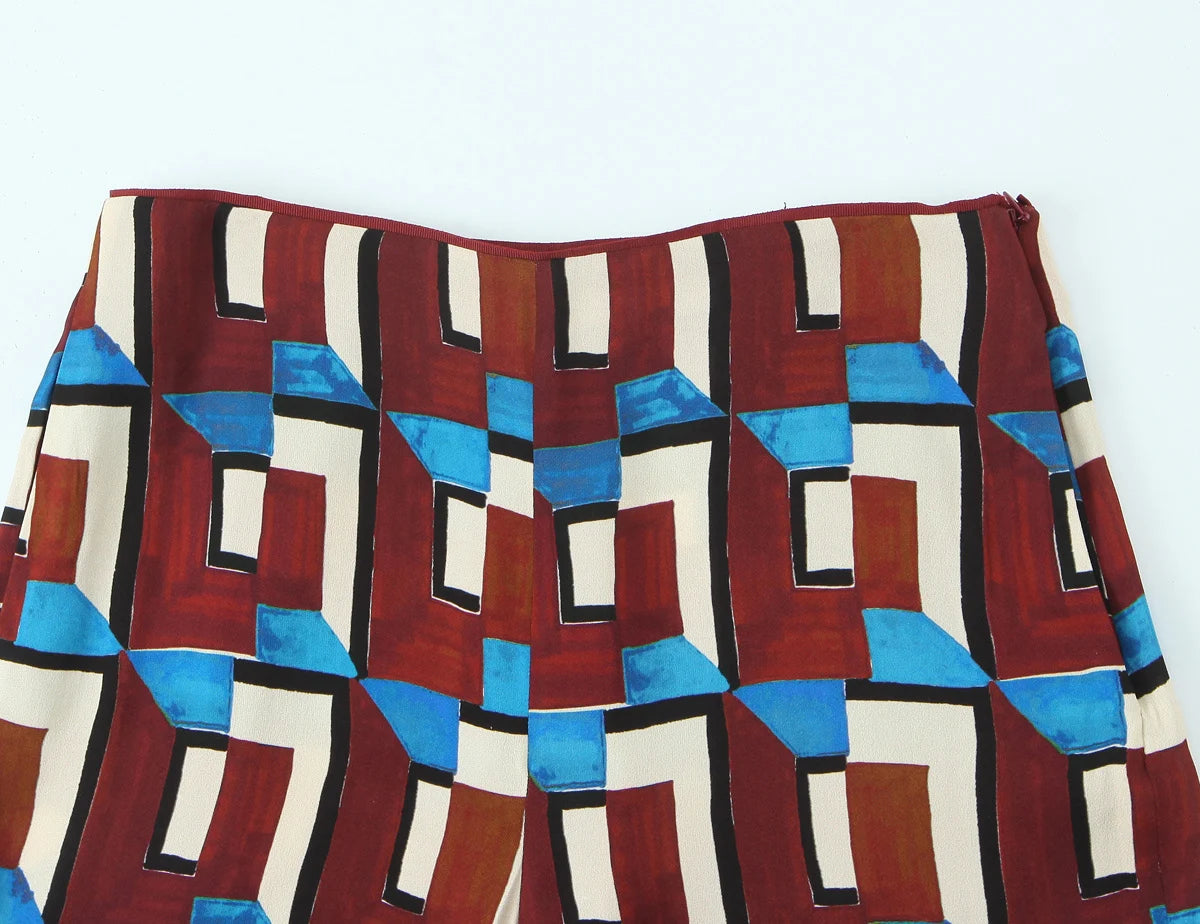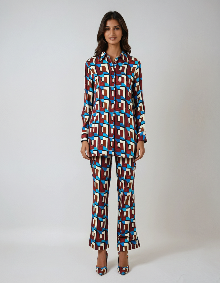 Wear as a full set with block heels and a leather clutch for high-impact streetwear flair, or break it up—layer the shirt over slim jeans for an editorial edge, or style the flares with a tucked-in crop top for a ‘70s revival. This is a look built for statement-making women who favor artful prints and sharp tailoring.