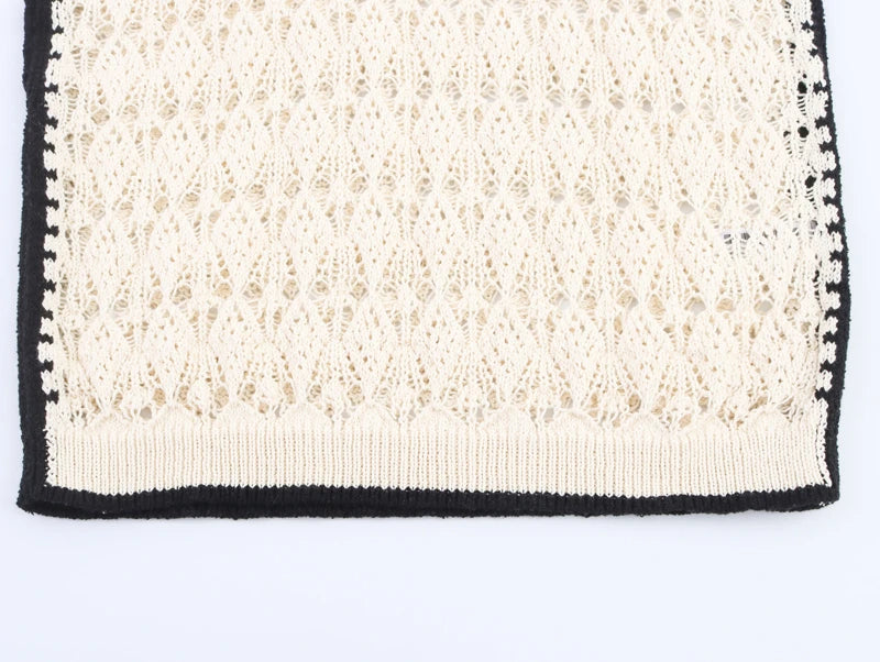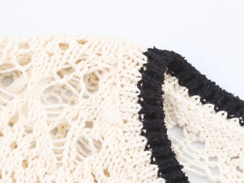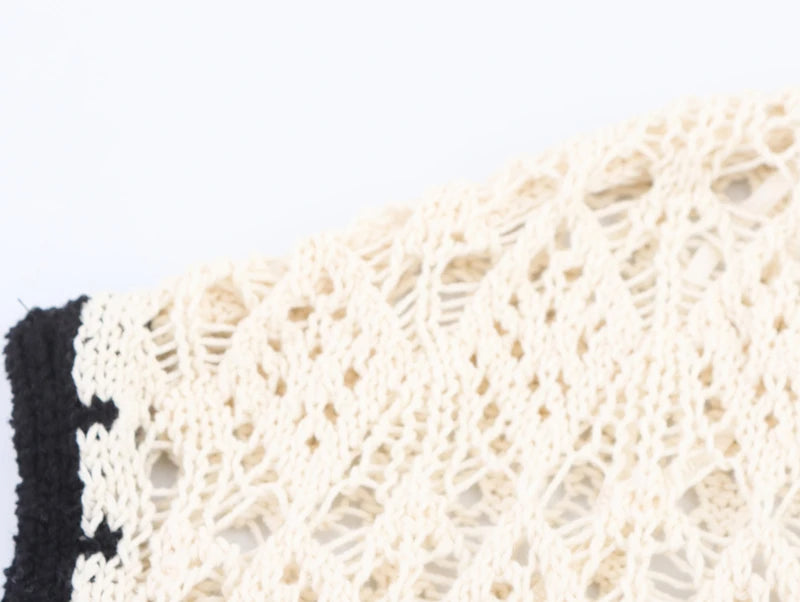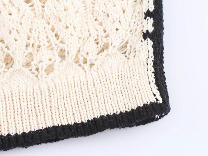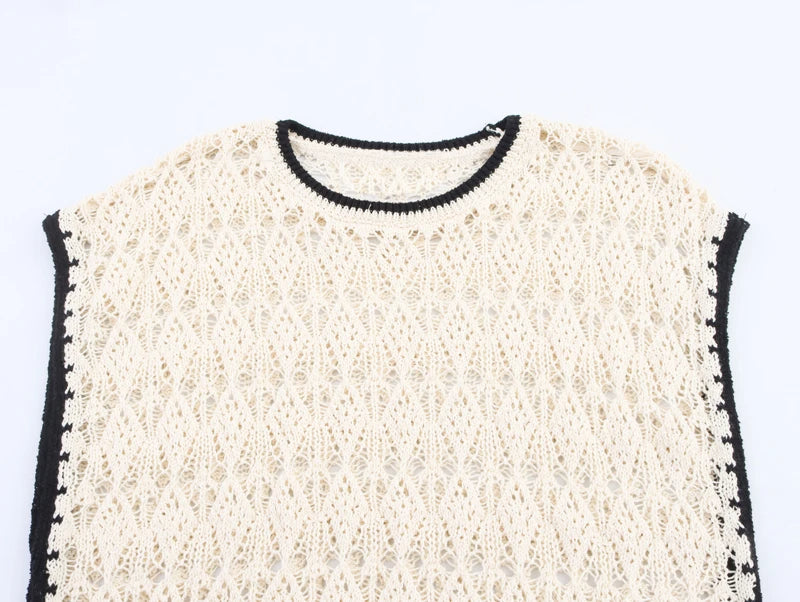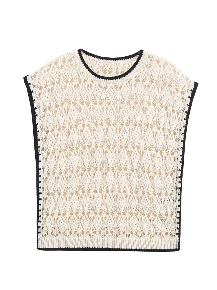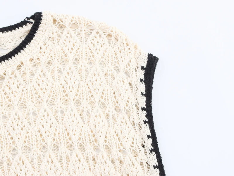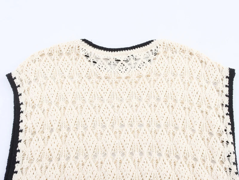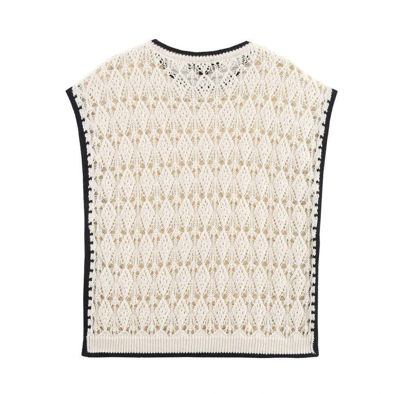 This sleeveless jacquard knit vest is the perfect fusion of simplicity and statement style. The classic O-neckline frames the face beautifully, while the color-block design brings a pop of visual interest. Delicate hollow-out detailing adds an airy, feminine touch, making it an ideal choice for sunny summer days.