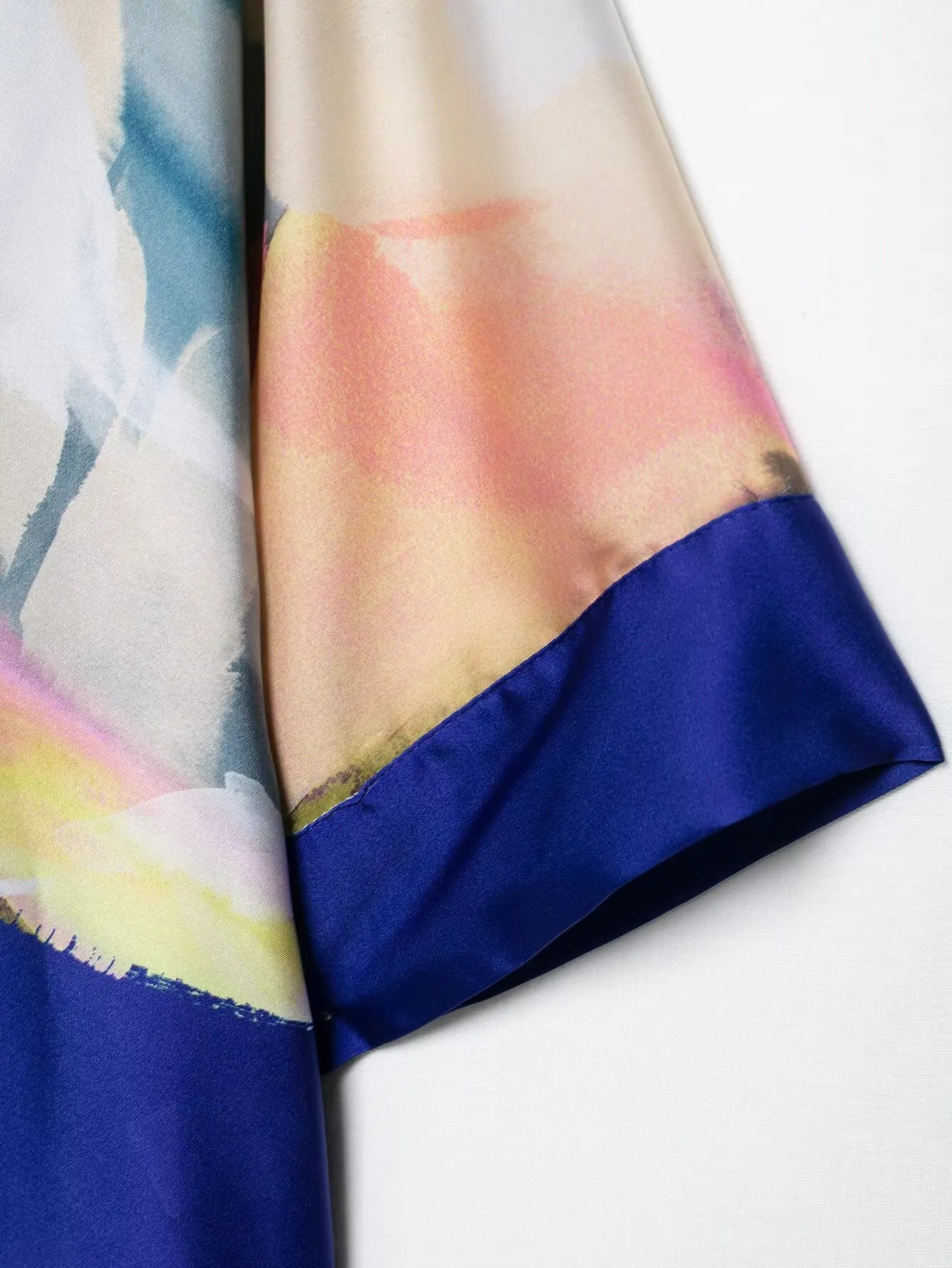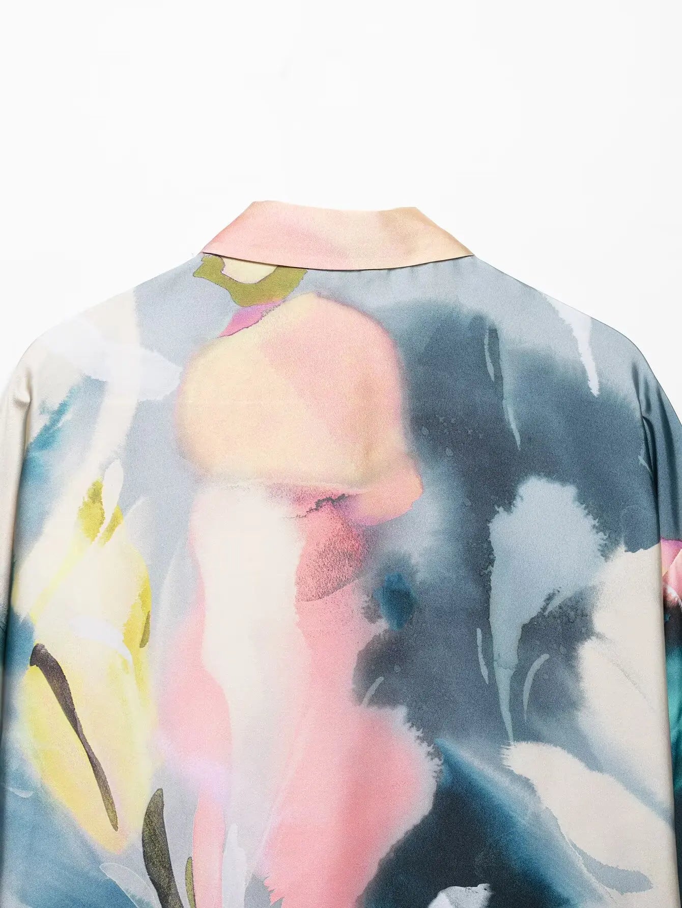 This eye-catching blouse blends office elegance with artistic flair, featuring a contrast tie-dye print on a smooth satin finish. The turn-down collar and single-breasted front offer a refined structure, while a decorative bow accent adds a feminine touch. The straight cut and regular fit ensure all-day comfort with polished appeal.