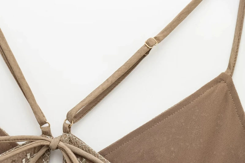 Make a statement this summer with a halter-style sleeveless top featuring a romantic V-neckline trimmed with delicate lace. Its cropped length highlights the waistline, while soft ruffles and gentle folds add playful movement. The floral print brings a fresh, feminine touch, perfect for warm-weather soirées.