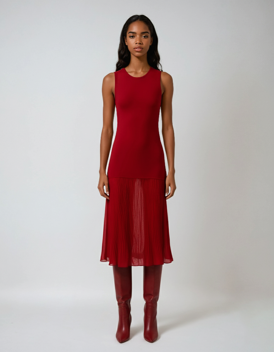 This sleeveless red dress turns heads with its bold simplicity and form-skimming silhouette. Featuring a classic O-collar neckline and tank-style sleeves, the straight-cut design elongates the body, while splicing knit details subtly enhance its structure. Designed for party nights and warm city strolls, it brings together casual confidence and understated allure.