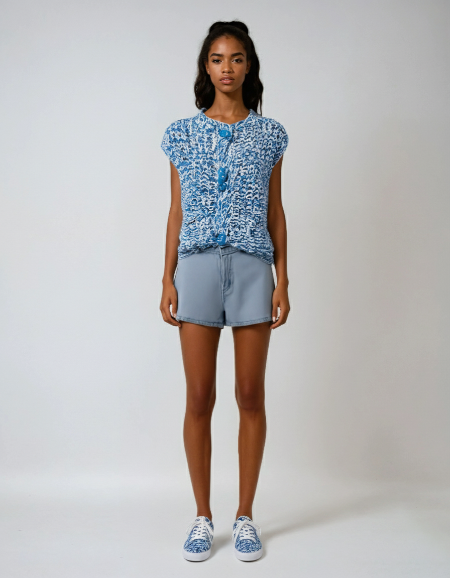 Cut in a regular fit with a standard thickness, this vest drapes naturally on the body—neither too tight nor oversized. The regular length flatters the waistline, making it easy to pair with both high-rise bottoms and flowy skirts. Lightweight yet structured, it’s designed to move with you, perfect for warm-weather days.