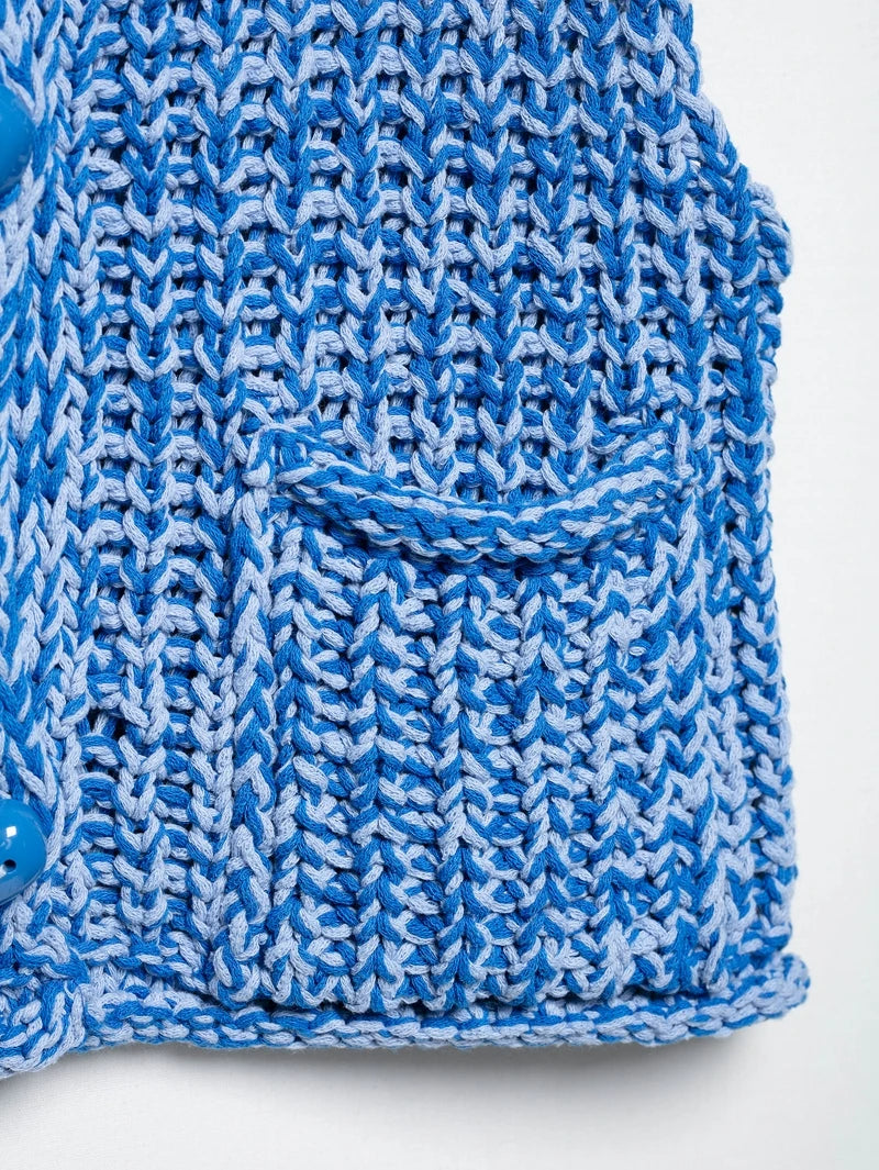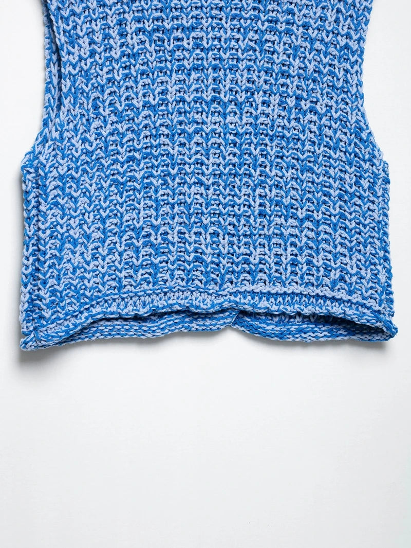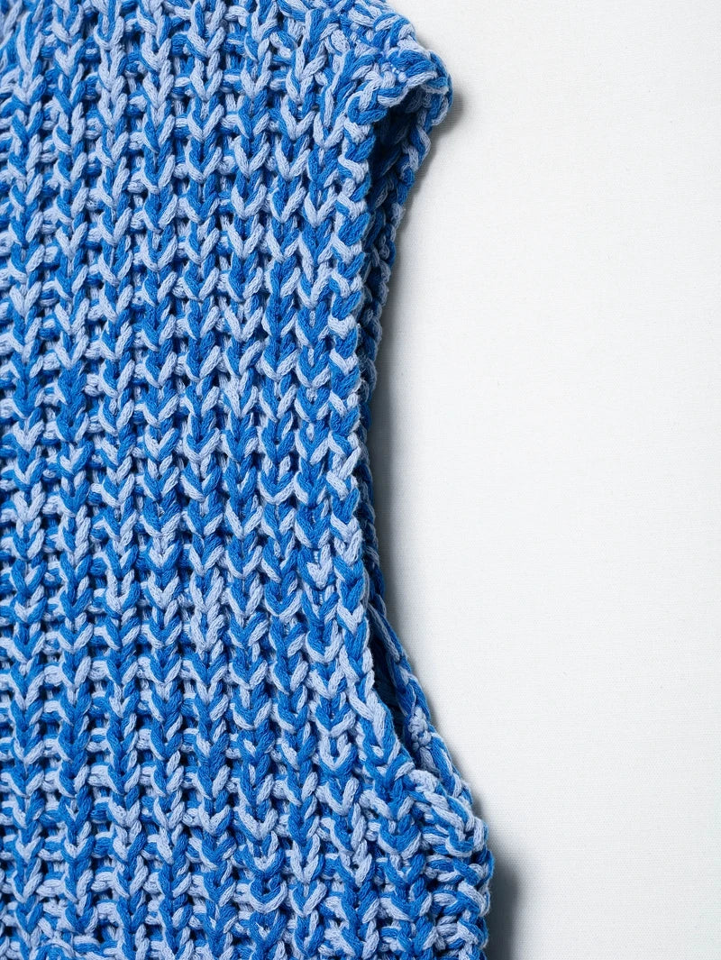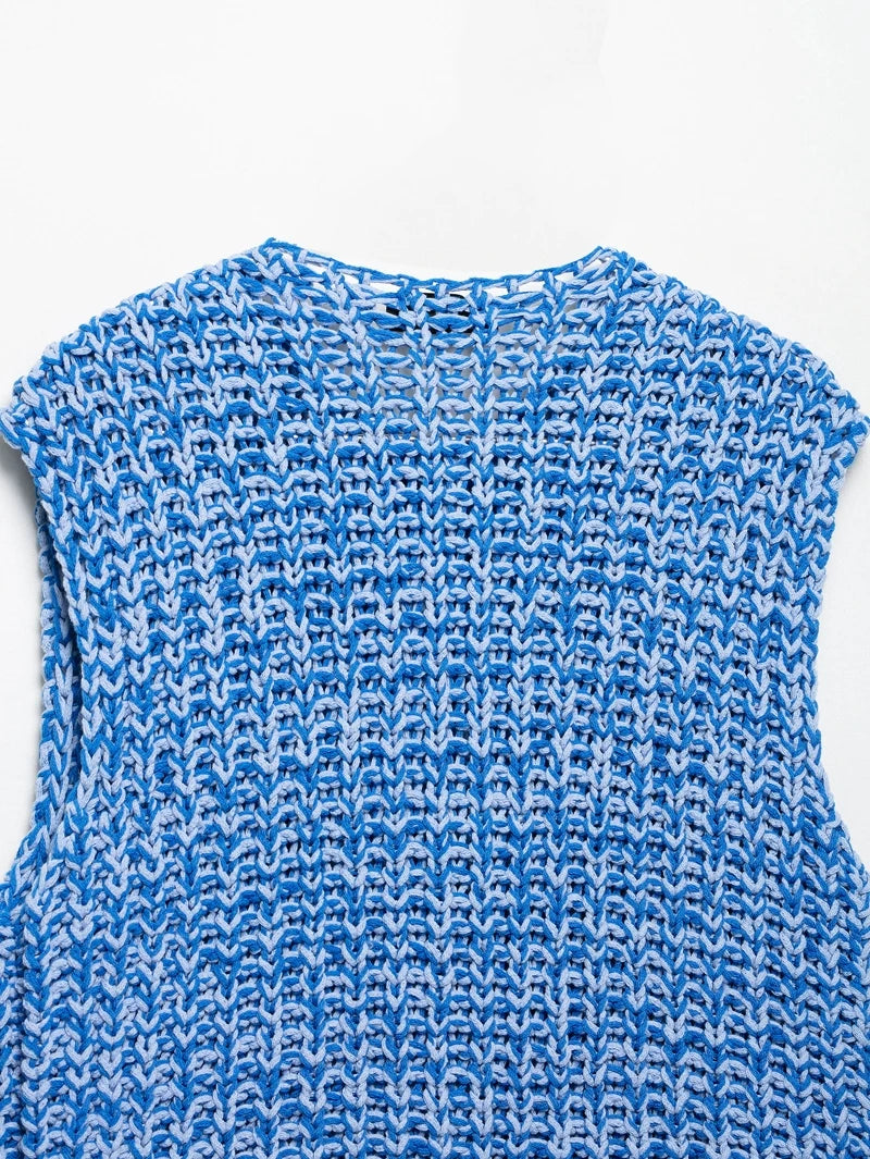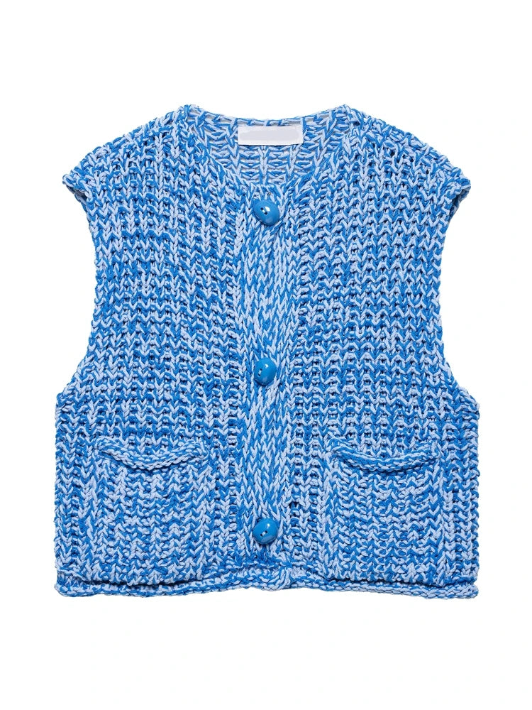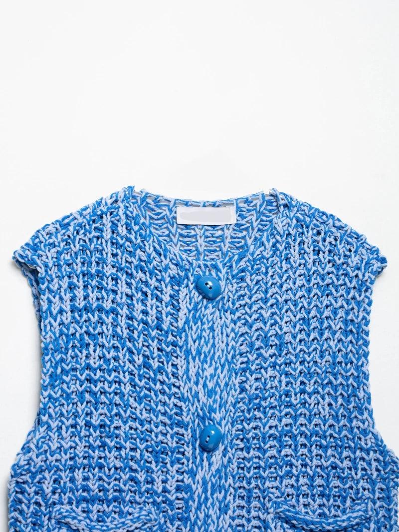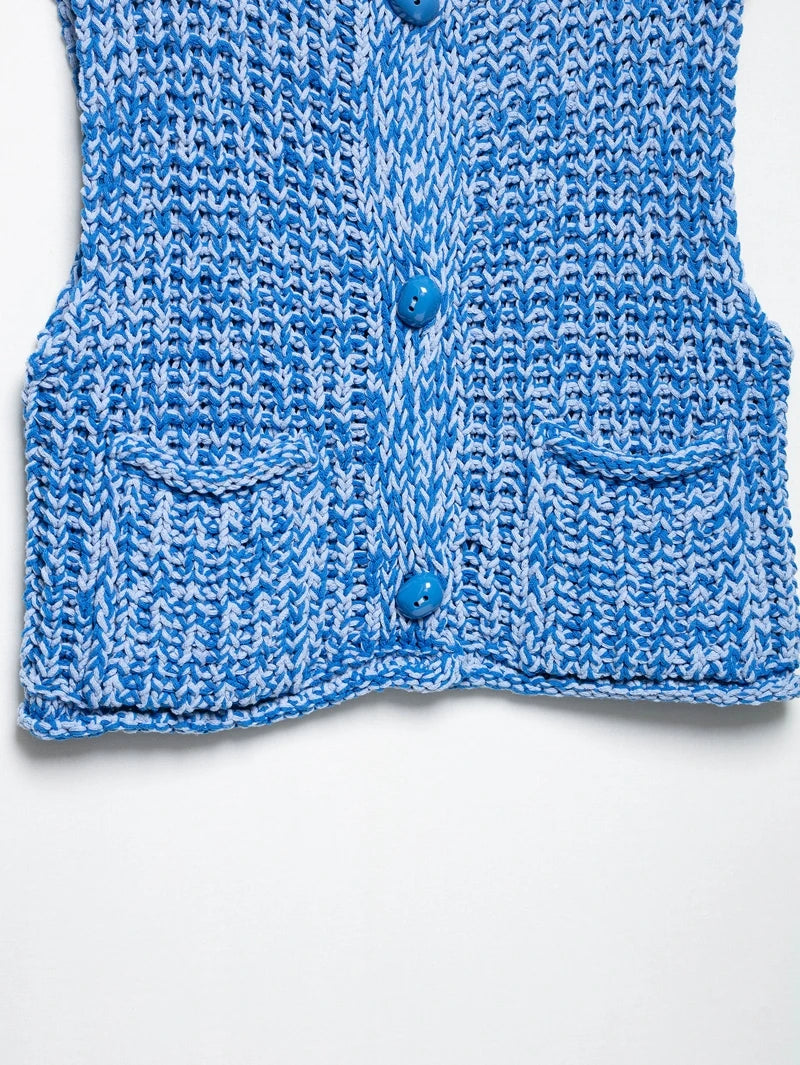 Effortlessly chic, this sleeveless knitted vest sweater brings a fresh twist to summer layering. Designed with a flattering V-collar neckline and a single-breasted closure, it offers both ease and elegance. The straight silhouette with ruffled detailing adds a touch of femininity, while functional front pockets make it practical for everyday wear.