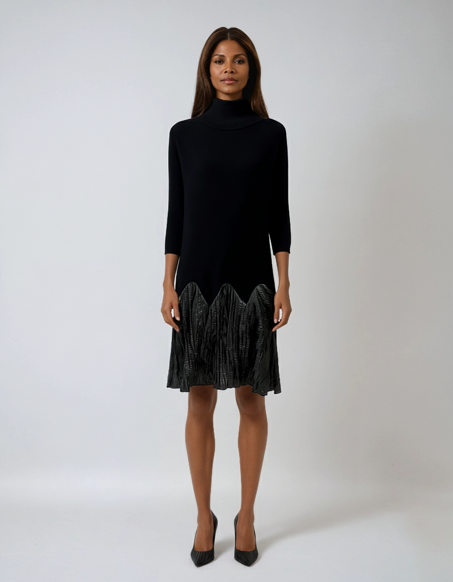 Elevate your wardrobe with the Black Pleated Splice Knit Dress, featuring a sophisticated turtleneck and long sleeves for added warmth and style. Its loose-fit design ensures comfort and ease of movement, while the pleated splice detail adds a refined texture and visual interest. Perfect for layering or wearing alone, this dress combines classic elegance with modern knitwear craftsmanship.