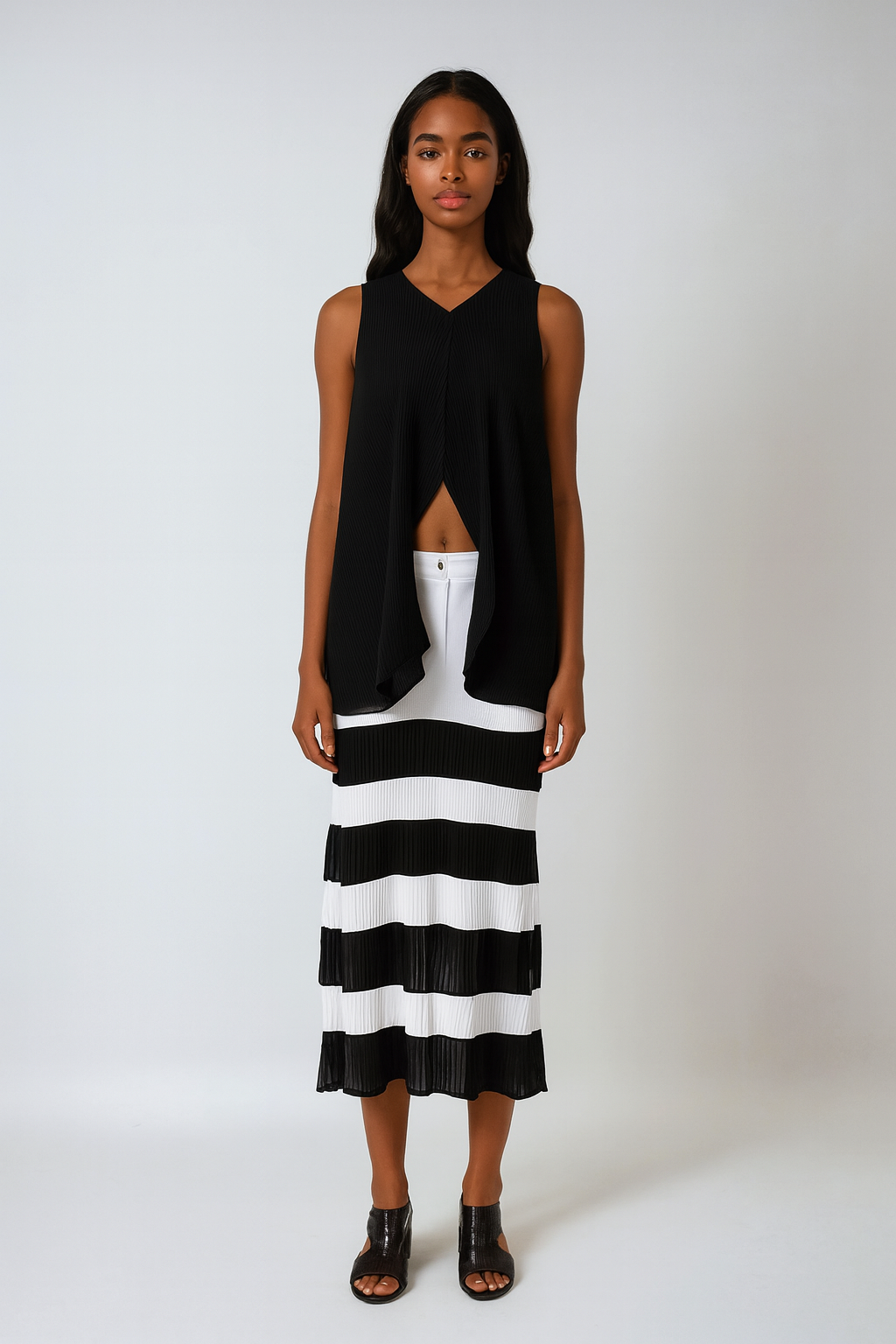 Made from a breathable blend of cotton and polyester, this vest offers lightweight comfort with structured drape. The vertical striping and artful pleats add architectural interest, perfect for layering over slim tops or flowy silhouettes. The piece is unlined and non-stuffed, making it ideal for warm-weather styling without sacrificing shape or depth.