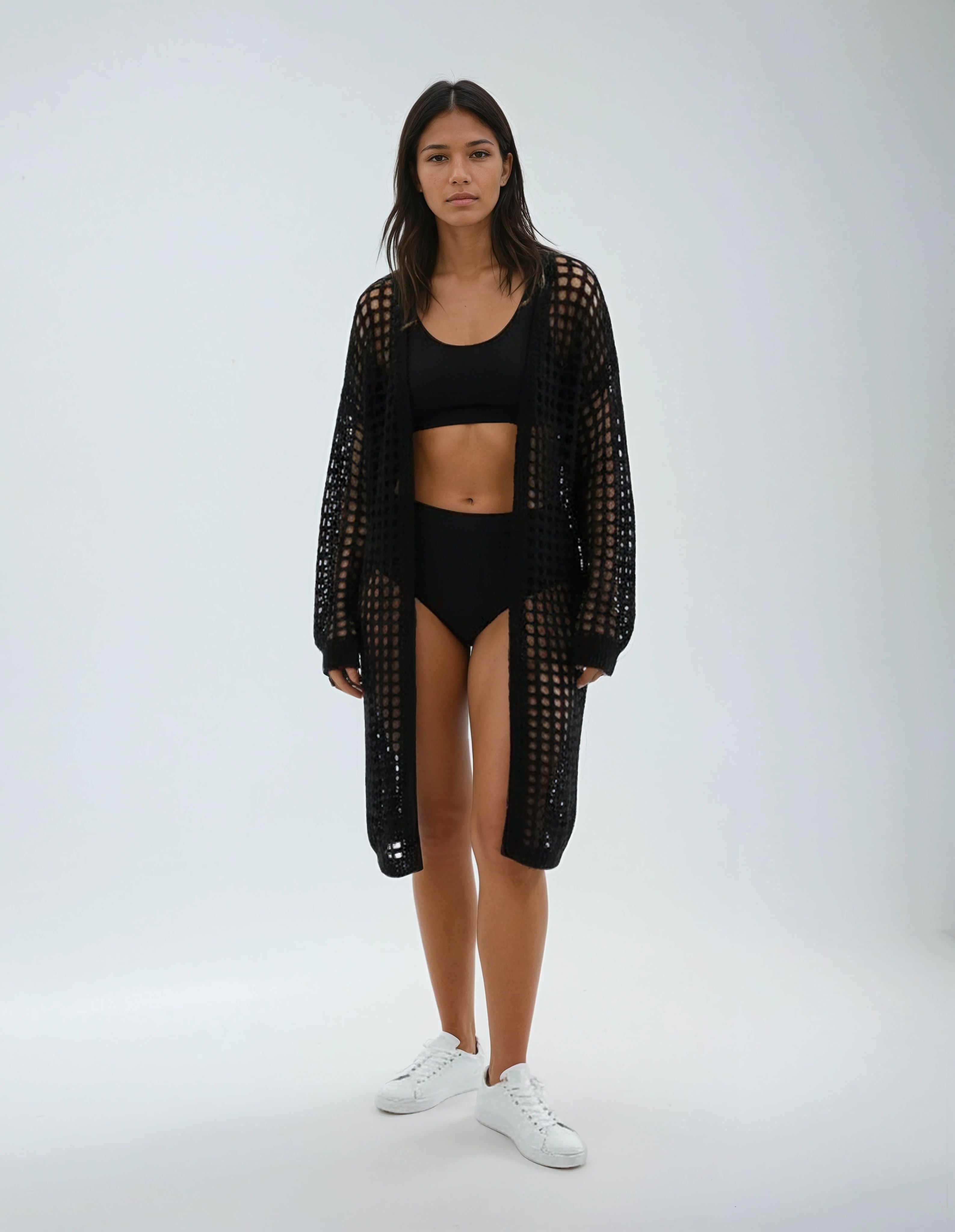 Bold and fashion-forward, this black knit long shirt dress is designed with an open grid pattern that creates a sheer, airy effect. Featuring a relaxed oversized silhouette, long sleeves, and a round neckline, it combines the comfort of knitwear with the daring edge of see-through styling. Perfect as both a dress and a layering piece, it’s versatile enough to transition from streetwear to resort looks.