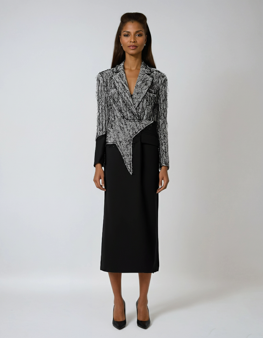 Style it with black trousers and pointed boots for a modern take on tailoring, or throw it over a fitted dress for an edgy twist on eveningwear. For a trend-forward ensemble, pair it with flared jeans and bold earrings. Whether worn at fashion week or on a stylish night out, this piece moves with you—and turns heads doing it.