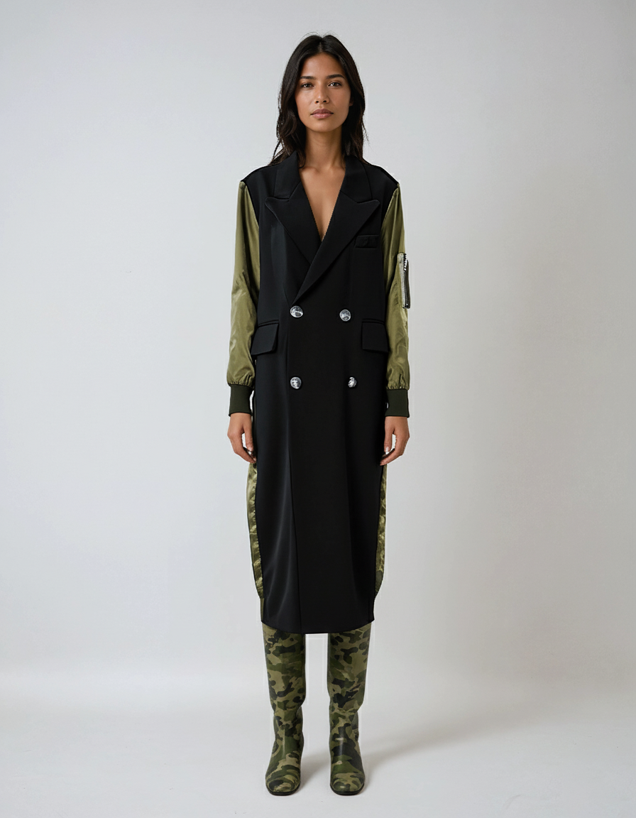Made from a durable cotton and polyester blend, this trench offers structure with a breathable touch. The color-block panels are sewn with precision to ensure seamless alignment, and the belt cinches the waist for a customizable fit. Designed with reinforced seams, classic storm flaps, and polished buttons, this piece blends fashion-forward aesthetics with utility.