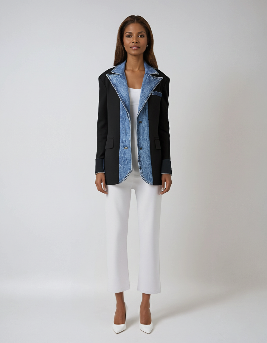 The Denim Spliced Contrast Blazer reinvents classic tailoring with an urban edge. This sharply cut silhouette features a sleek black base, contrasted with a bold denim front panel, lapels, and collar. Exaggerated lapel lines and contrast topstitching create graphic structure, while the elongated cut delivers a modern, powerful fit.