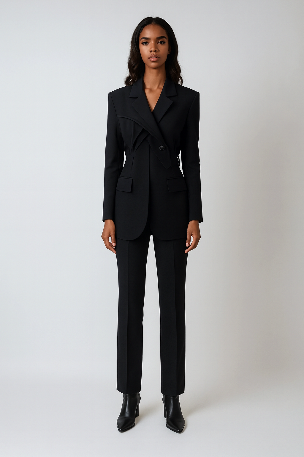 A bold reinvention of a classic, this blazer features a sculptural layered front with overlapping panels that create a three-dimensional double-breasted effect. Sharp shoulders and precise tailoring convey power and elegance, while the curved hem softens the silhouette for a modern finish.