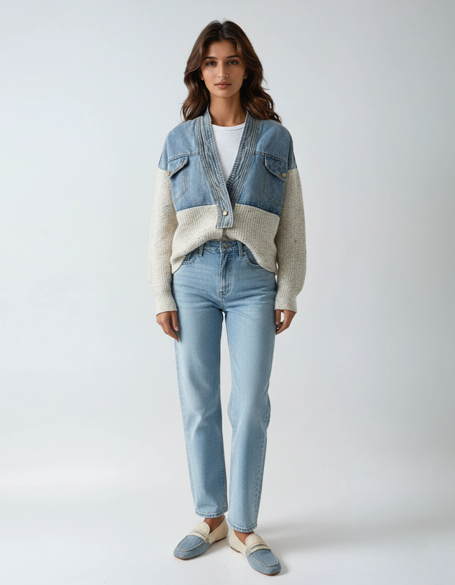 A modern twist on a timeless silhouette, the Beige V-Neck Knit Cardigan blends soft knit textures with structured denim-inspired detailing. The deep V-neckline, button-front closure, and relaxed drop-shoulder cut create a casual yet elevated look. With its two chest flap pockets and subtle contrast between knit and denim tones, this cardigan feels effortlessly chic and versatile.