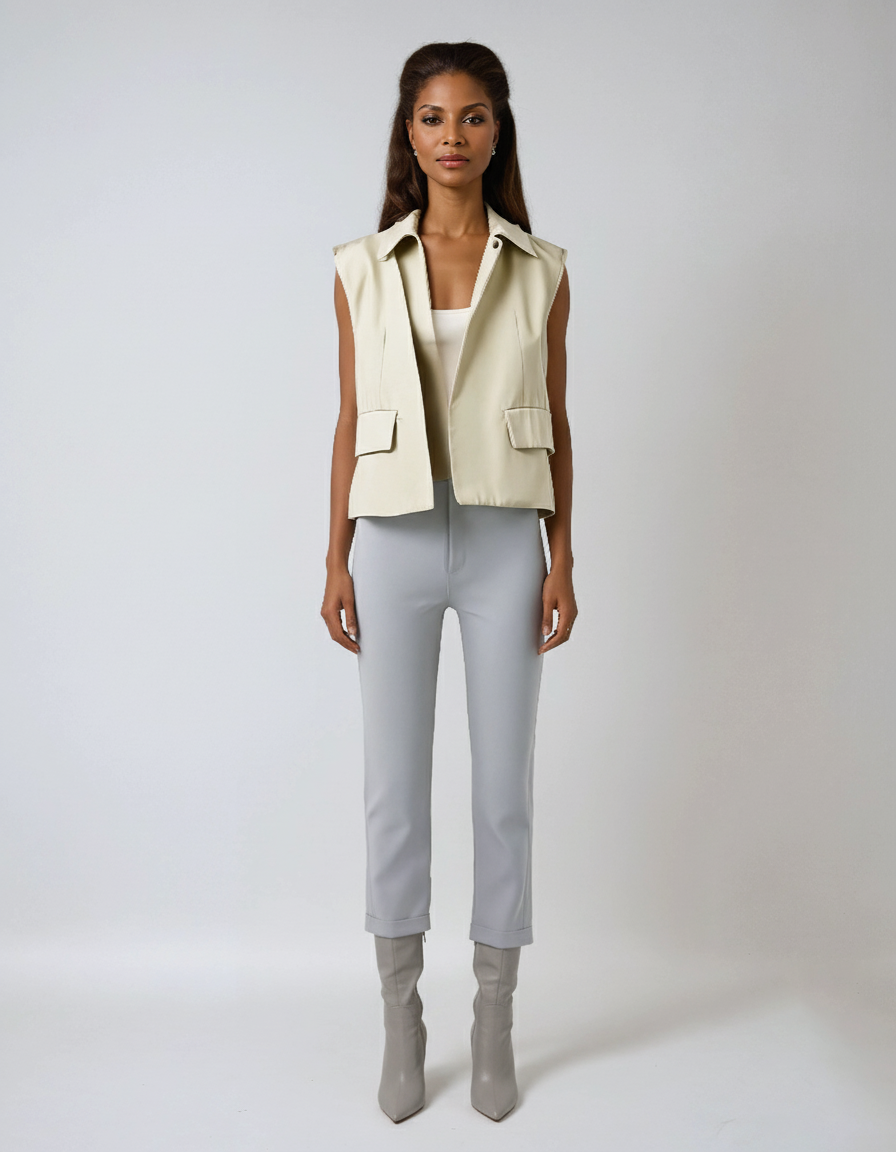 This vest jacket is a simple yet chic layering piece. Pair it with slim trousers and loafers for a polished casual look, or wear it over a turtleneck with boots for a modern autumn ensemble. For a relaxed weekend edit, style it with jeans and sneakers. Whether for the office, coffee outings, or seasonal transitions, it’s the piece you’ll reach for on repeat.