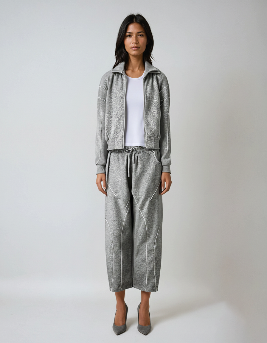 Pair with white sneakers and a crossbody bag for a casual city look, or layer a structured coat over it for airport-ready comfort with style. Wear the set together for monochrome impact, or split them up—wide pants with a crop top, hoodie with biker shorts—for off-duty versatility.