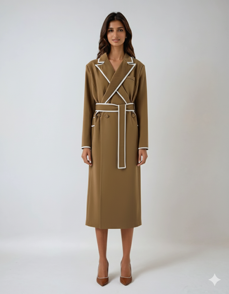 Designed for impact with refined restraint, the Khaki Cross Color-block Blazer delivers structured elegance with a fashion-forward edge. This full-length, double-breasted blazer features a sleek notched collar, oversized crossover panels, and tailored seaming that elongates the body. The solid khaki color is elevated with subtle tonal contrast paneling that gives the appearance of layered sophistication—perfect for transitional dressing across all seasons.