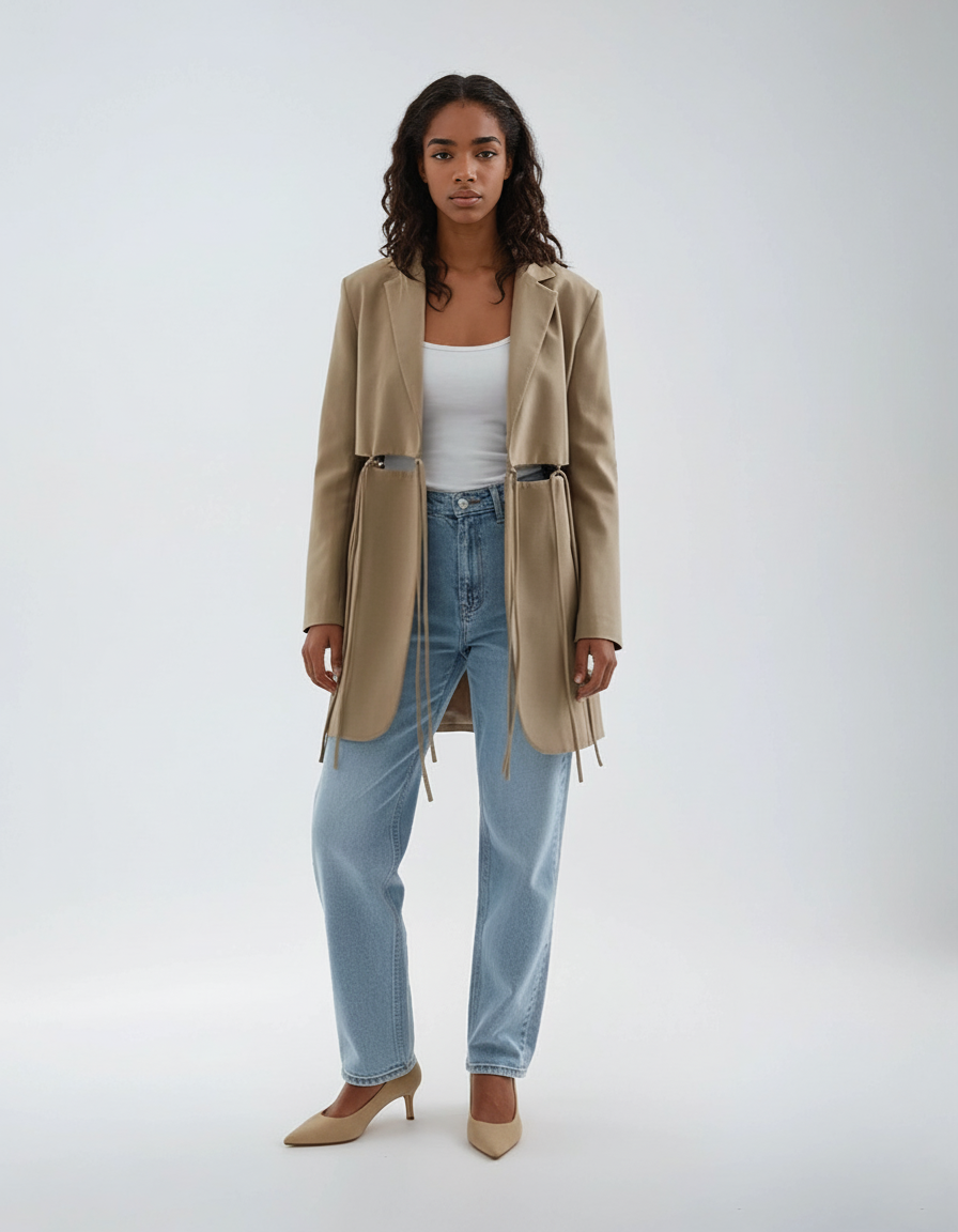 A modern reimagination of the classic blazer, this piece stands out with its hollow-out waist design and long cascading ties for a sleek, fashion-forward finish. The structured notched lapel collar and clean tailored shoulders balance elegance with casual versatility, while the open-front cut adds a relaxed yet chic edge.