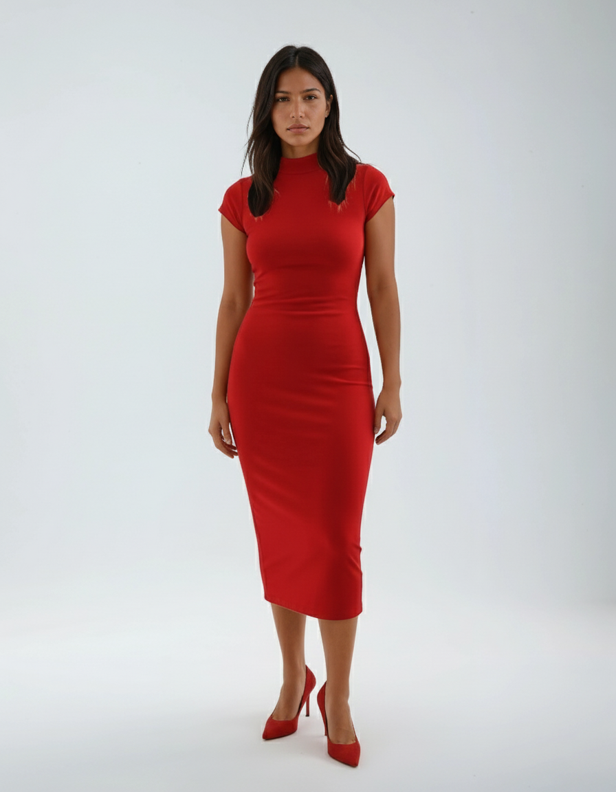 Ideal for evening events, summer parties, or upscale gatherings, this dress pairs seamlessly with strappy heels and bold jewelry for a glamorous look. For a more understated approach, style it with minimal accessories and sleek flats to let the silhouette shine. The half high collar and solid knit texture provide a modern canvas to dress up or down, making it a versatile essential in any wardrobe.