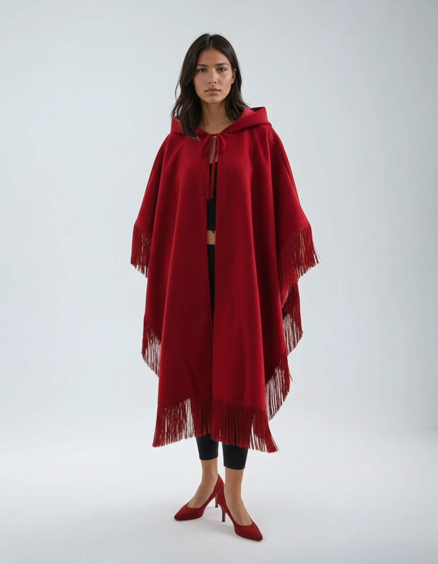 Dramatic and free-flowing, this cloak cape combines a loose oversized silhouette with a hooded neckline for a mysterious yet chic aesthetic. The standout feature lies in the tassel fringes that trim the hemline and sleeves, adding movement and texture with every step.
