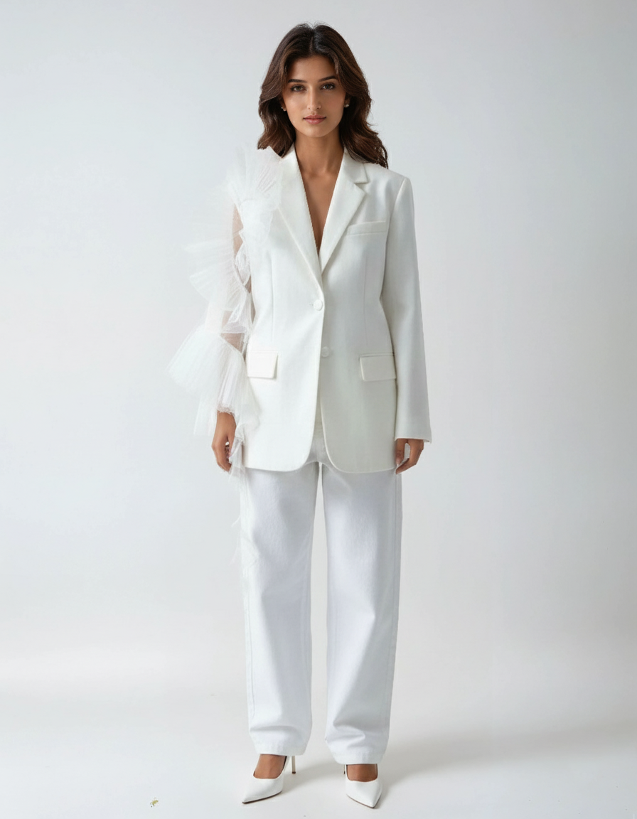 An iconic statement piece, this blazer redefines power dressing with its dramatic asymmetrical organza ruffle detailing. Flowing from the shoulder down the sleeve, the sheer organza creates sculptural movement that contrasts beautifully with the blazer’s structured tailoring. The classic notched lapel and two-button closure anchor the bold design in timeless sophistication.