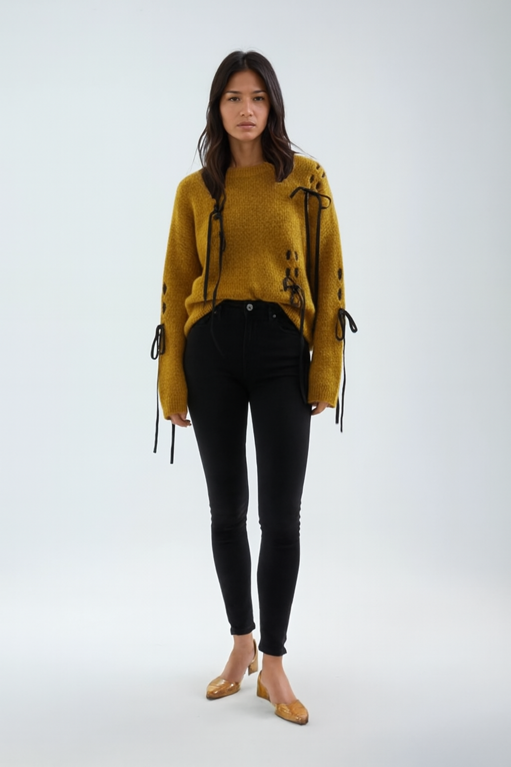 Made from cotton knit, the sweater is soft, breathable, and warm for cooler weather. The contrasting black ribbons stand out against the rich mustard tone, offering both decorative flair and an adjustable fit around the arms. Ribbed hems at the cuffs, neckline, and waist complete the look with structure.