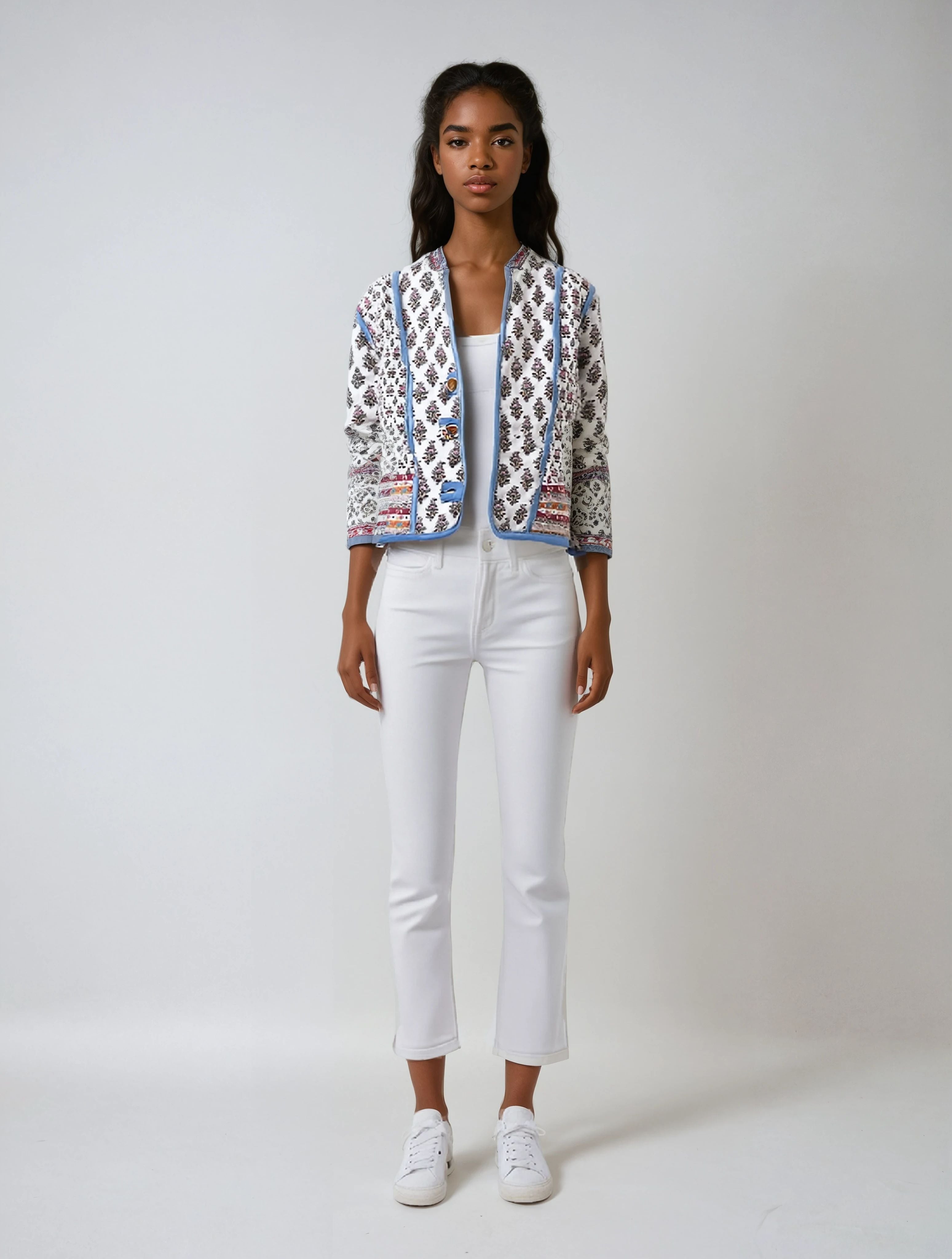 A statement piece that blends heritage charm with modern versatility, this short coat features a reversible design—offering two looks in one. The main side showcases a delicate floral print framed with sky-blue contrast piping and golden buttons, while quilted panels and patterned borders add depth and character. The cropped length and V-neck silhouette make it easy to layer over dresses or high-waisted trousers.